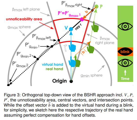 }Blink-Suppressed Hand Redirection (BSHR) is based on the body-warping algorithm by Cheng et al. Similar to the algorithm by Cheng et al., BSHR continuously increases the hand offset when eyes are open. However, the continuous shift of the virtual hand is only applied below detection thresholds. When the user closes their eyes, an additional, instantaneous shift is added to the virtual hand position.