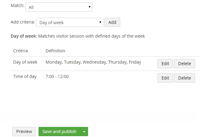 - Add a new criteria of type Day of week and tick the boxes for Monday to Friday.