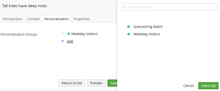 - Personalisation group picker is an data type instance of the multi-node tree picker property editor, for the selection of groups for given piece of content