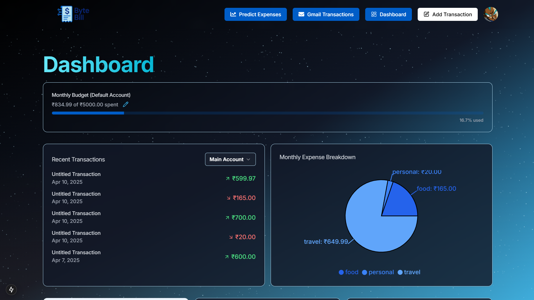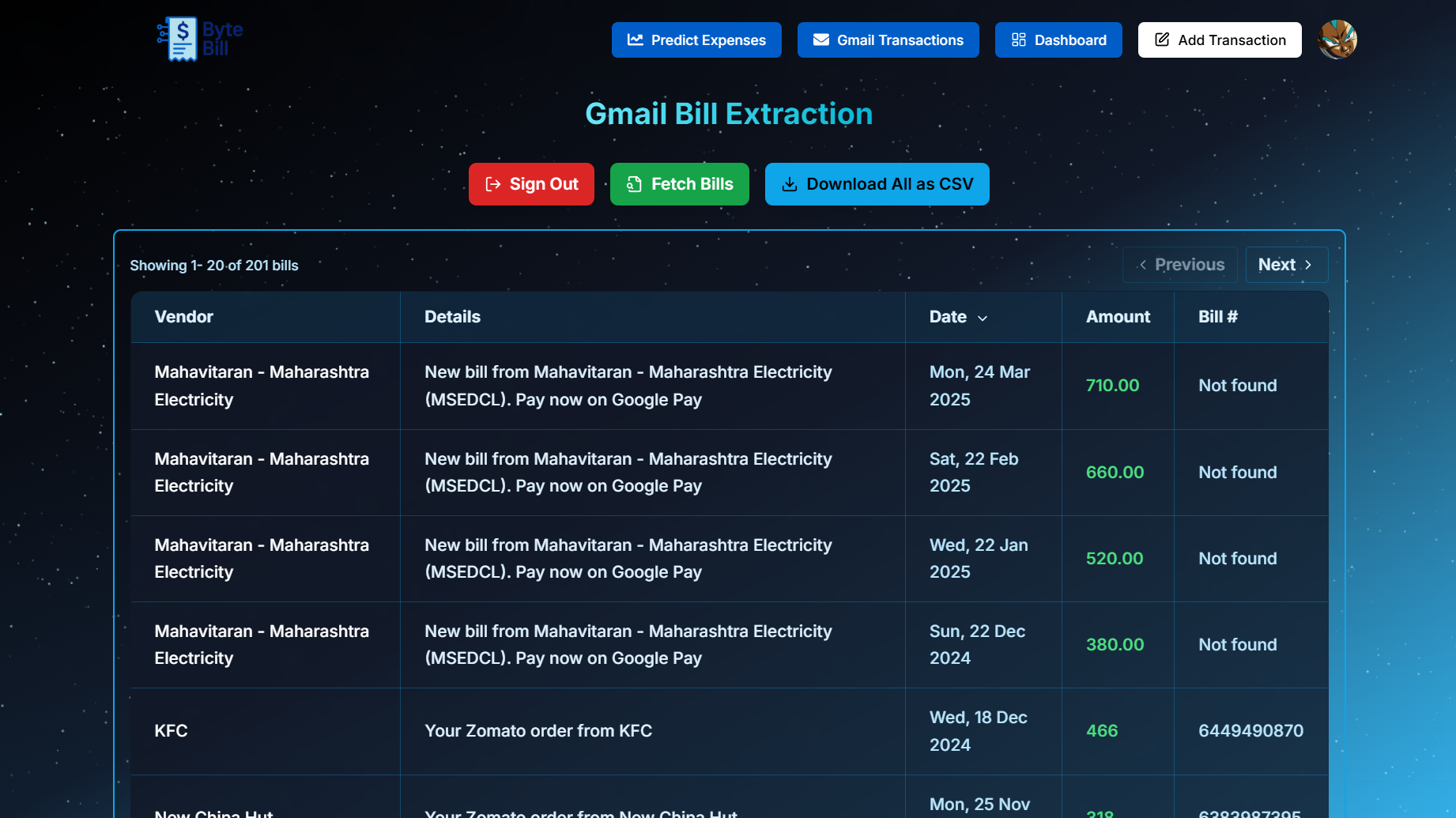 ByteBill is a smart bill extraction app that connects with your Gmail account to automatically detect, extract, and organize billing information from your emails. Designed to simplify personal expense tracking, ByteBill uses the Gmail API and intelligent parsing to bring all your bills into one clean, accessible dashboard.