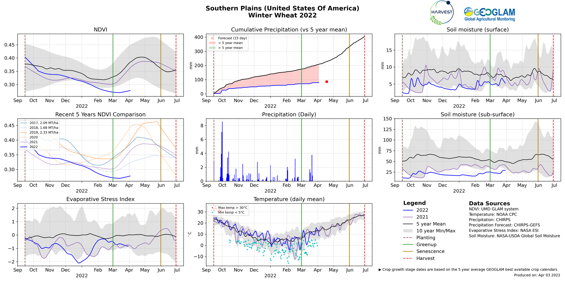 With the help of satellites, we are able to monitor crops throughout the growing seasons and can use a combination of satellite derived time series to quantify critical indicators related to crop health for a specific region and crop over time. One such example of satellite-derived products are the GEOGLAM-NASA Harvest Agrometeorological (AGMET) Earth Observation Indicators, which are supported by the global remote sensing community and updated every 7-12 days to ensure that users are provided with the most up to date information. Displaying climate, environmental, and vegetative variables that impact agricultural outcomes, the AGMET Indicators were born from an agricultural stakeholder-identified need for a simple way to visualize and frequently monitor crop health with the ultimate goal of identifying potential cropping concerns as the growing season progresses and before a food shortage materializes. Satellite data provides a wealth of information to meet these needs including Agromet parameters: