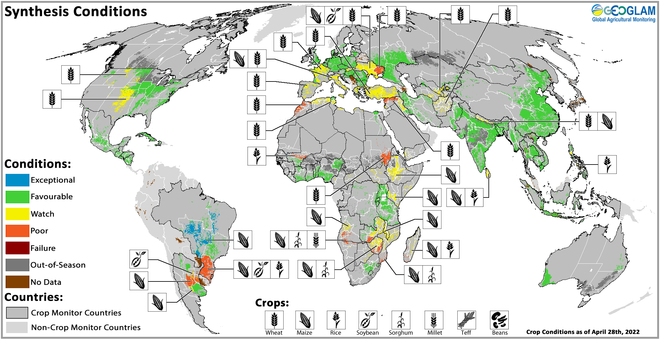 GEOGLAM Crop Monitor for AMIS and Early Warning synthesis map showing where crops are grown around the world, and the crop conditions as of April 28, 2022. (source: https://cropmonitor.org/)