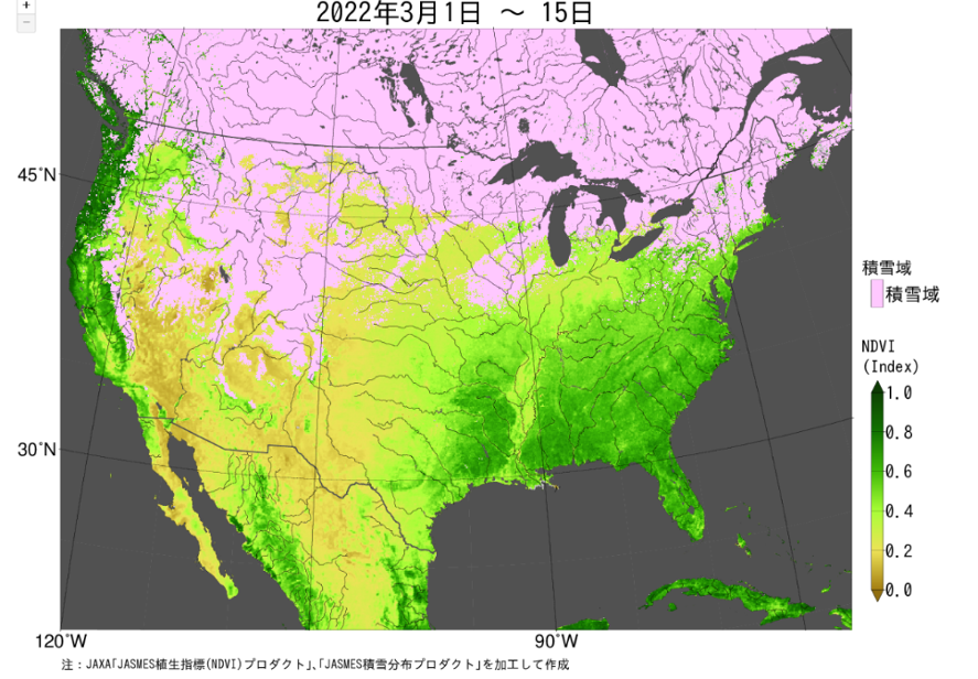 JAXA with Japanese MAFF provide agrometeorological information including Precipitation, Drought Index, Soil Moisture, Solar Radiation, Surface Temperature, Vegetation Index and anomaly, etc. Rainfall, Agriculture, Land, GPM Core Observatory, SHIZUKU (GCOM-W), MODIS, Multiple Satellites (GSMaP) bi-Monthly on JASMIN for Asia and on JASMAI for selected world areas. By using JAXA WMS with JASMIN/JASMAI products, the anomaly of Southern Plain in the US can be zoomed in with visualized map. The following are examples of composite averaged NDVI and NDVI anomaly.