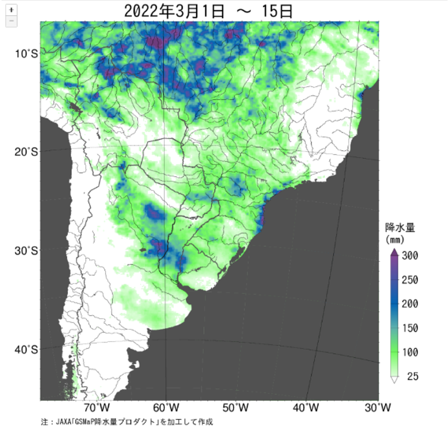 Accumulated and anormal precipitation information derived from GSMaP by JASMIN/JASMAI on this March is shown in following because in Southern Brazil crops did not receive the expected amount of precipitation, which negatively impacted yields of the spring planted crop.