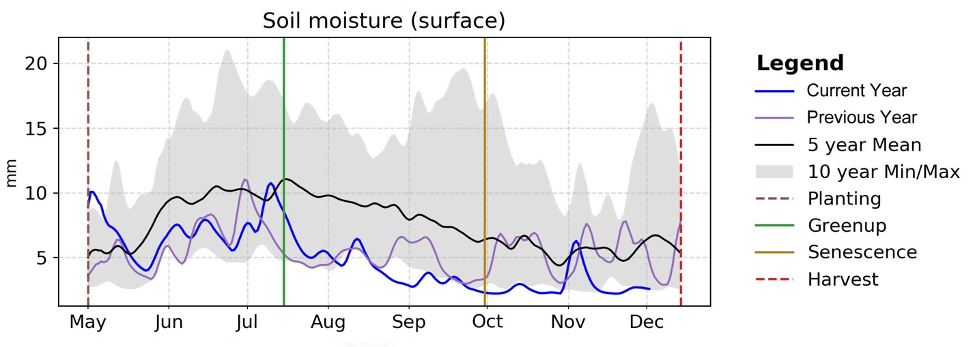 Soil moisture can be measured using satellite data and directly affects crop growth. (source: https://cropmonitor.org/tools/agmet/)