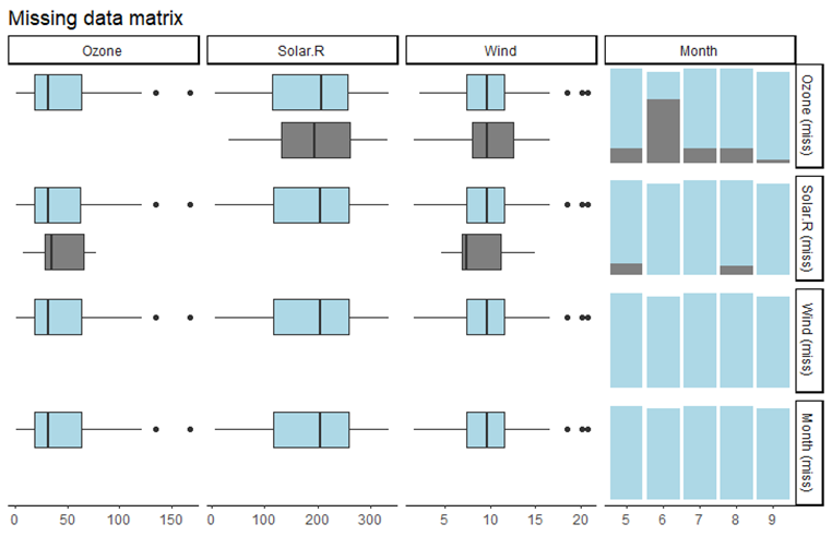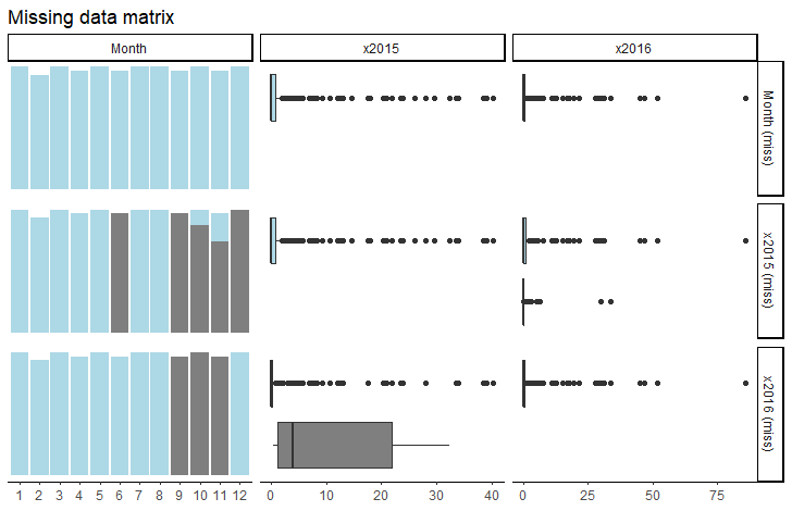 airqualitydata:airquality %>% mutate(Month = factor(Month)) %>% missing_pairs(c("Ozone", "Solar.R", "Wind", "Month"))bind_shadowfunction in thenaniarpackage.airquality %>% bind_shadow() %>% group_by(Solar.R_NA) %>% summarise_at(.vars = "Ozone", .funs = c("mean", "sd", "var", "min", "max"), na.rm = TRUE)Or, with Roger's Malawi rainfall data if we just consider the month, and years 2015 and 2016 we can quickly see that most missing values occur between September and December.