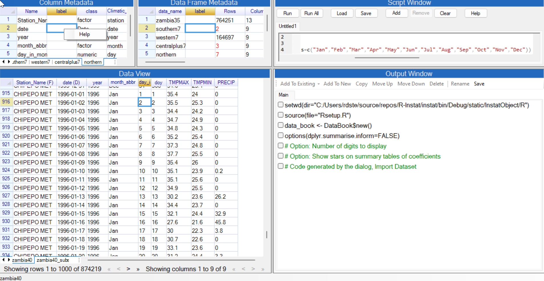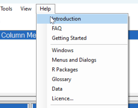 @rdstern The current updated system of Windows is as follows: c) Each right-click menu has a Help option. This goes to a right-click option in the help file in the data window d) The column metadata window has 2 of the same right-click menus (rows and data frame) as the data window, but I have to click the far end on the left along the rows for the menu to appear. The help on clicking it also goes to R packages and commands. The column variable is not clickable in the column metadata e)The data frame metadata window has the same data frame, right-click menu as the data window, and the column metadata window. It also has the help menu, but when you click it, it takes you to the R packages and commands under Gridextra f) Right-clicking within the column metadata or data frame metadata window just gives a single Help item (shown in the figure below) g) The new script windows have a help button that goes to the script window in the help. (I hope we can also consider whether this window can now be combined with the script windows, or it should remain separate?) j) The output window has buttons at the top, with the help option. |