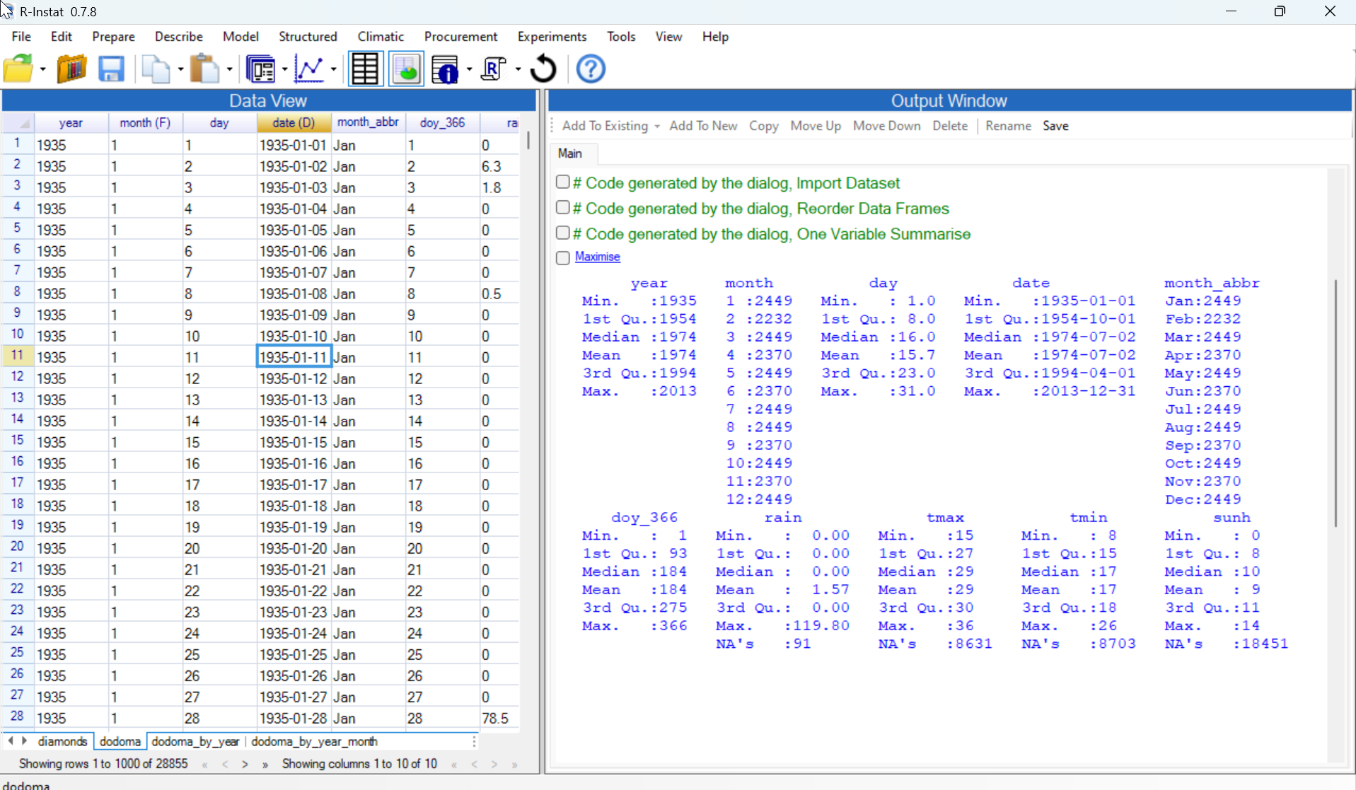 @lloyddewit I continue the windows discussion, because I can't count! There are actually 9 windows in R-Instat! In your 5 you have omitted Patrick's new Maximise window - which still needs improvement. I explain below as a first draft of text, and also a possible video. I hope it is clear and very simple for you - otherwise I need to explain it very differently. The R-Instat windows Here is R-Instat with data from the two tutorials together: This shows the 2 main windows. On the left is the main data window and the output, or results are in the window on the right. The data window has tabs at the bottom, to move from one data set to another. For larger data sets it is just a window onto part of the data, aand you can use the arrows at the bottom to move from one page to another. The output, or results window also has tabs. All output goes to the main tab, but you can copy important results to additional tabs as you wish. You usually use dialogues with R-Instat and each dialogue gives one way to access two further windows. At the bottom is a Help button. Pressing that button opens the An alternative route to this window is the Help menu. This allows you to choose your entry point into the Help window. Returning to the dialogue the bottom right button is for more advanced users and is always labelled This window also has tabs. One is for the log, which automatically keeps a record of the R commands that have corresponded to your dialogue use of R-Instat. Then you can have one, or more, tabs to examine, edit and try different R scripts. The View menu provides another route to the Log/Script window as follows: These are the main windows, but there are also 3 more windows to complete your picture of the data, and two more for the outputs. The data first. Start by returning to the default layout - that's via the curly arrow on the toolbar. Or, from the View menu, press to return to the default layout. Then, possibly from the toolbar click on the i icon to get more information about the data. This opens the Column metadata window. as follows: This is another tabbed window that corresponds to the tabs on the data window. For a given data frame, this window has one row for each variable. So, the diamonds data, with 10 variables, has the same 10 rows in this window. It gives the details of each variable. One property of the variables, that isn't used much in R, but we like, is the variable labels. It is often convenient to have reasonably short variable names plus a description. If you ever import survey data from SPSS, or other software, then Add another set to show this - from sjmisc say Then, either from the toolbar, or from the View menu, add the data frame metadata as well. This has one row for each data frame, and includes details of their dimensions. Finally, on the data side, R provides a viewer, if you would like to see all your data together. This is eaither via a right-click on the bottom tab - with the View Data Frame option. Or it is also from the Prepare > Data Frame > View Data dialogue. On the Output, or results, side there is a Maximise button associated with each output. This opens a secondary output window - what do we call it? This is for any results, either numeric or graphical. It is particularly useful for pivot/tables, charts, etc. I need to describe this now. It also provides a home for plotly and enables these outputs, particularly pivot tables to be saved as html. You can have lots of them open, but they each appear as saeparate windows - should they be tabbed!!! An alternative, for graphs, is the R graph viewer. This is resizable - also dangerous - and permits graphs to be saved in various formats. I hope we can add to our maximised window, so we don't need the R graphics window? Is that a reasonable action. |
