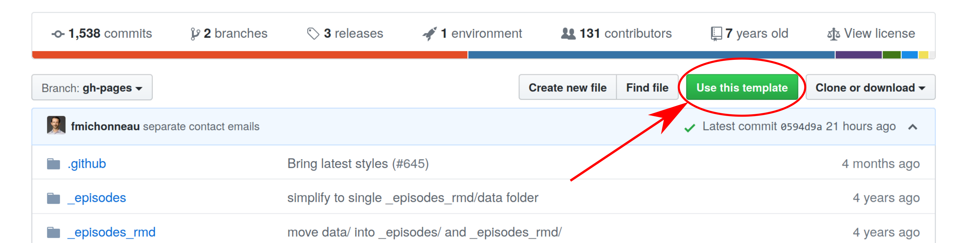 2. On this page (https://github.com/carpentries/workshop-template), click on the green "Use this template" button (top right)