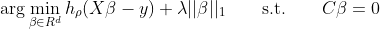 This regression problem uses the Huber loss as objective function for robust model fitting with l1 and linear equality constraints on the β vector. The parameter ρ=1.345.
