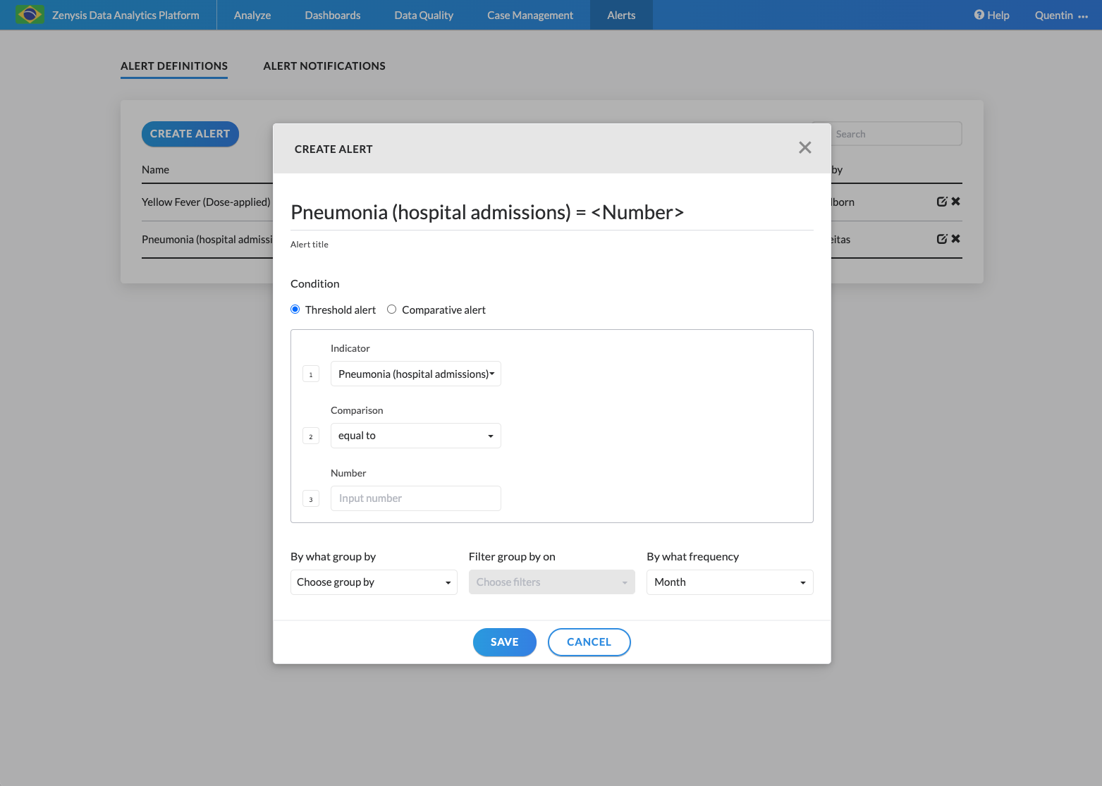 An alert is a query that is constructed around a threshold of interest or a relationship between two indicators to you and your team. When these thresholds are crossed in the data, an alert is automatically triggered in the platform. Instead of retrospectively looking for how many cases of a certain disease were reported in a certain area, you can set up an alert that will proactively trigger an automated notification when a certain number of cases are reported in a given area. This is especially useful for epidemiological and data quality use cases.