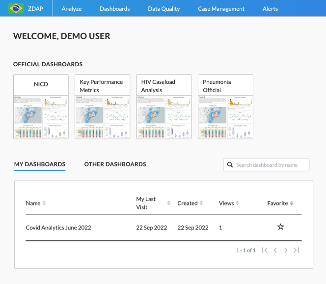 From the Overview Page, you can easily access official dashboards and other dashboards you or your colleagues have created. For each dashboard, key information such as date of creation, your last date of visit, and number of views is displayed.