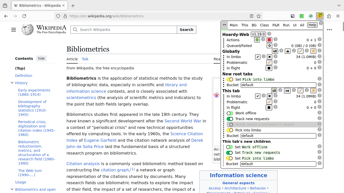 Then, I pressed the "Replay" button to switch to a replay page generated by hoardy-web serve for the above capture (i.e. that button re-navigated that tab to http://127.0.0.1:3210/web/2/https://en.wikipedia.org/wiki/Bibliometrics, which hoardy-web serve then immediately redirected to the latest archived replay version of that URL):