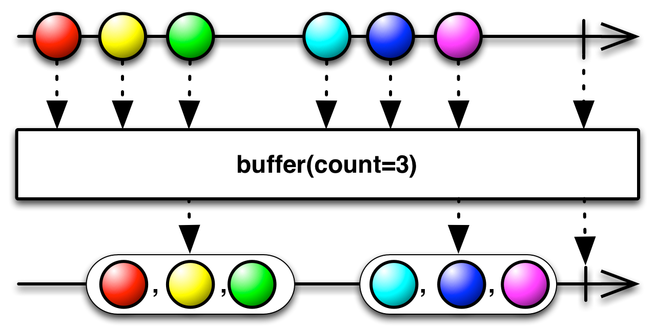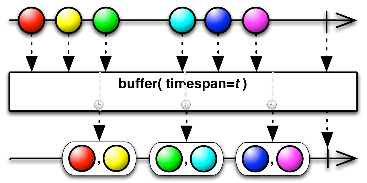 buffer( )emits a new bundle of items for every count items emitted by the sourceObservable, or, if timespan has elapsed since its last bundle emission, it emits a bundle of however many items the sourceObservablehas emitted in that span, even if this is less than count.