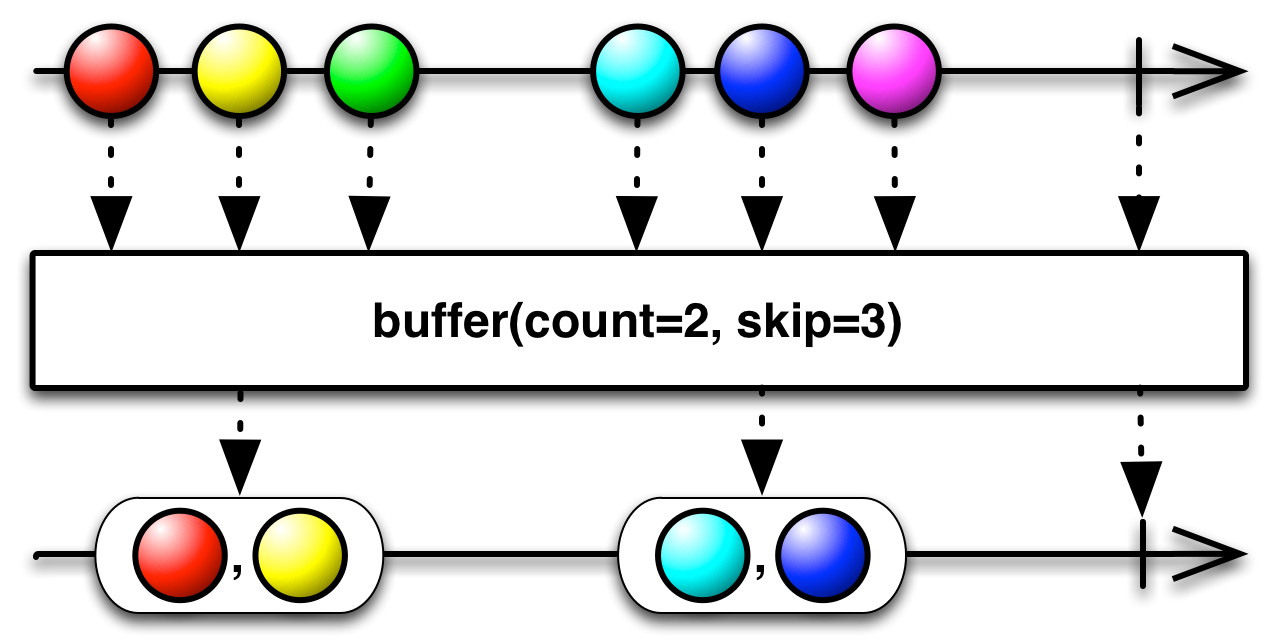 buffer( )create a new bundle of items for every skip item(s) emitted by the sourceObservable, each containing count elements. If skip is less than count this means that the bundles will overlap and contain duplicate items. For example, compare the following two uses ofbuffer( )on the same sequence: