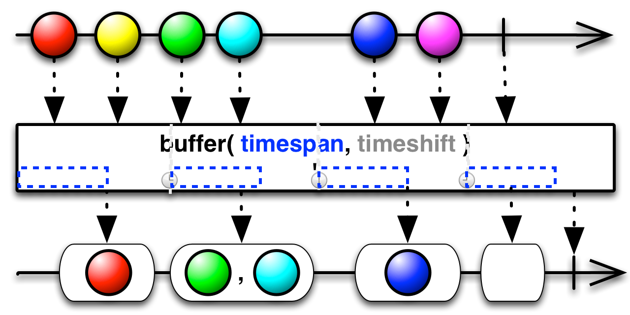 buffer( )creates a new bundle of items every timeshift, and fills this bundle with every item emitted by the sourceObservablefrom that time until timespan time has passed since the bundle's creation, before emitting the bundle as its own emission. If timespan is longer than timeshift, the emitted bundles will represent time periods that overlap and so they may contain duplicate items.