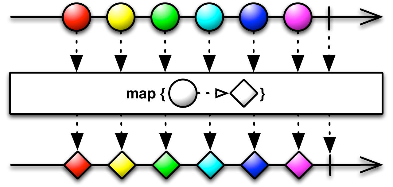 The map( ) method applies a function of your choosing to every item emitted by an Observable, and returns this transformation as a new Observable. For example, the following code maps a function that squares the incoming value onto the values in numbers: