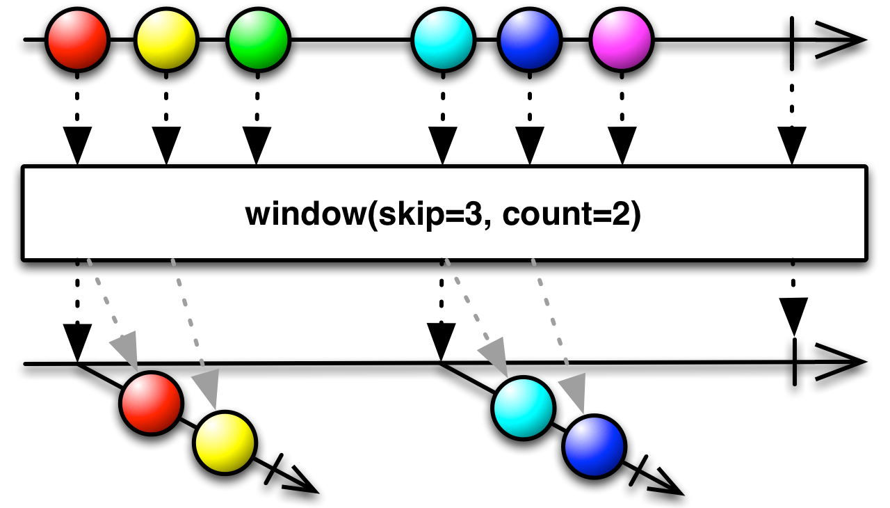 window( )opens its first window immediately. It opens a new window beginning with every skip item from the sourceObservable(e.g. if skip is 3, then it opens a new window starting with every third item). It closes each window when that window has emitted count items or if it receives anonCompleted( )oronError( )call from the sourceObservable. If skip = count then this behaves the same aswindow(source, count); if skip < count this will emit windows that overlap by count - skip items; if skip > count this will emit windows that drop skip - count items from the sourceObservablebetween every window.