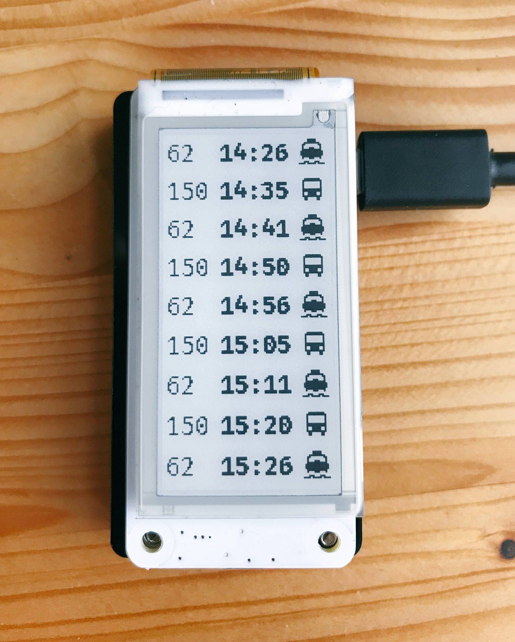 A raspberry pi offline transit schedule, showing the upcoming departures for selected train & bus stations on a 2" e-ink display.