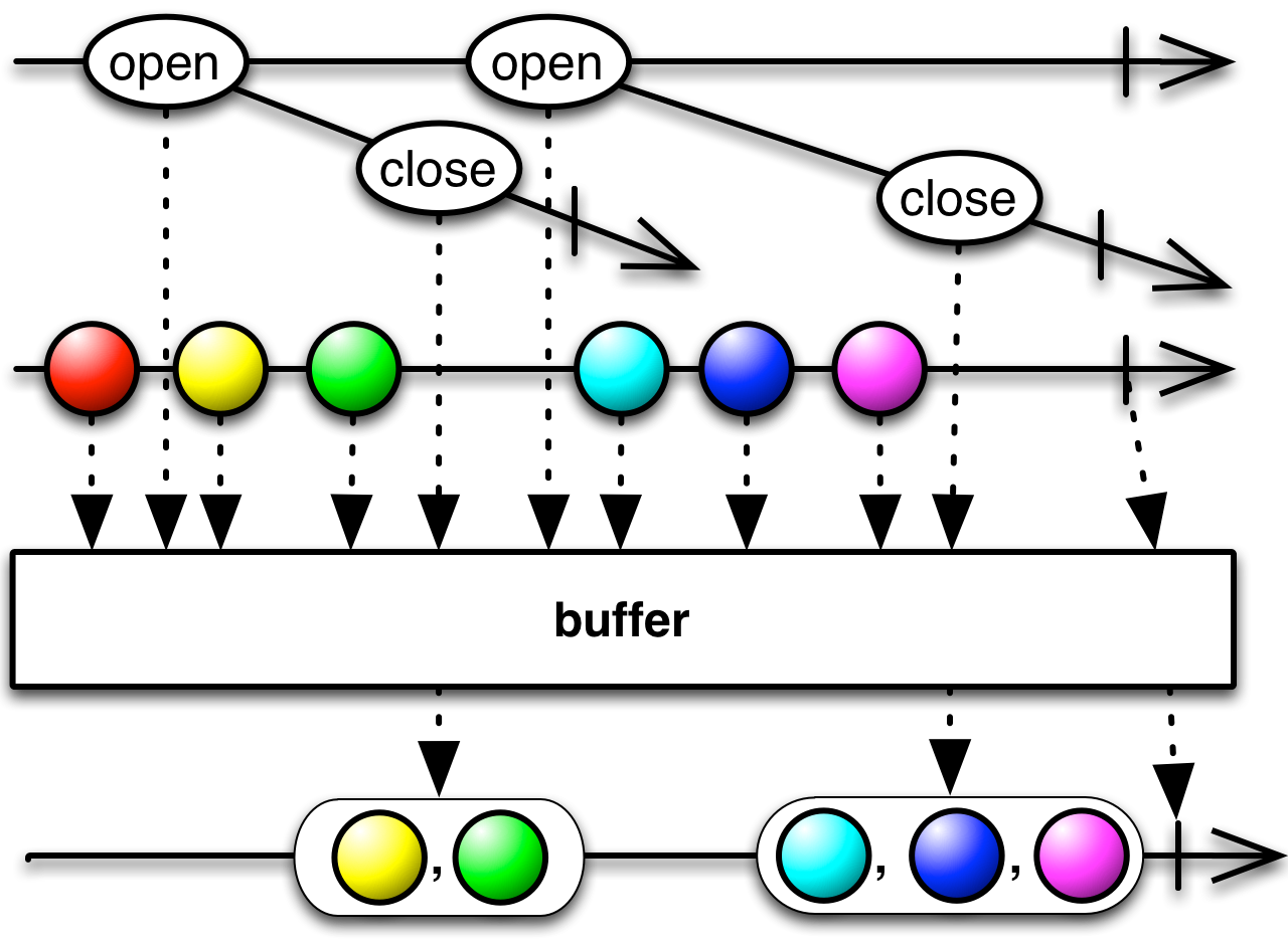 buffer( )monitors anObservable, bufferOpenings, that emitsBufferOpeningobjects. Each time it observes such an emitted object, it creates a new bundle to begin collecting items emitted by the sourceObservableand it passes the bufferOpeningsObservableinto the closingSelector function. That function returns anObservable.buffer( )monitors thatObservableand when it detects an emitted object, it closes its bundle and emits it as its own emission.