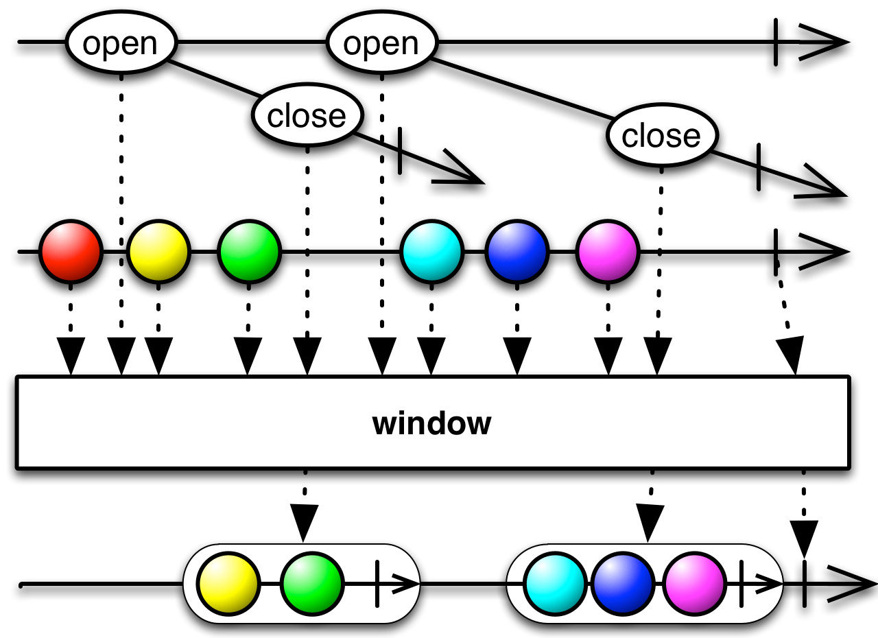 window( )opens a window whenever it observes the windowOpeningsObservableemit anOpeningobject and at the same time calls closingSelector to generate a closingObservableassociated with that window. When that closingObservableemits an object,window( )closes that window. Since the closing of currently open windows and the opening of new windows are activities that are regulated by independentObservables, this version ofwindow( )may create windows that overlap (duplicating items from the sourceObservable) or that leave gaps (discarding items from the sourceObservable).