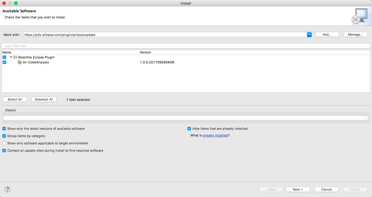 输入Update Site地址:https://p3c.alibaba.com/plugin/eclipse/update 回车,然后勾选Ali-CodeAnalysis,再一直点Next Next...按提示走下去就好。 然后就是提示重启了,安装完毕。