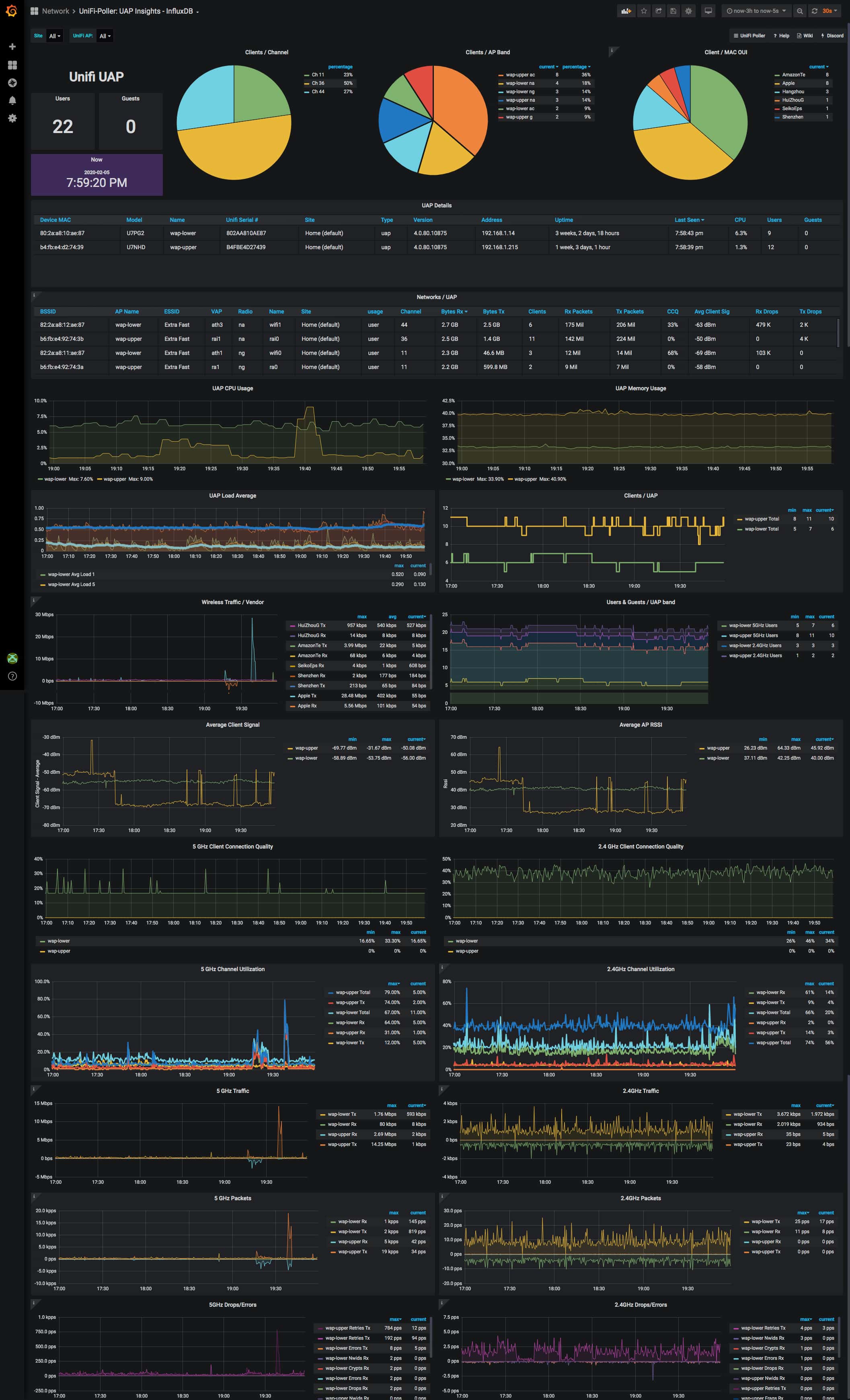 Collect your UniFi controller data and report it to an InfluxDB instance, or export it for Prometheus collection. Twelve Grafana Dashboards included; with screenshots. Six for InfluxDB and six for Prometheus.