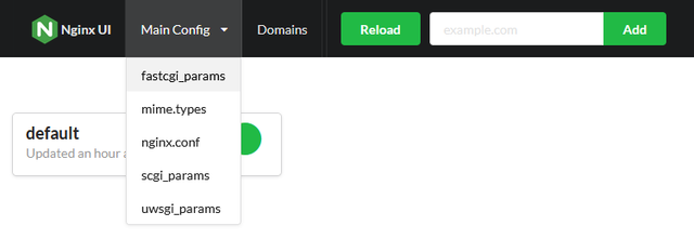 - nginx:/etc/nginxWith the menu item Main Config the Nginx specific configuration files can be extracted and updated. These are dynamically read from the Nginx directory. If a file has been added manually, it is immediately integrated into the Nginx UI Main Config menu item.