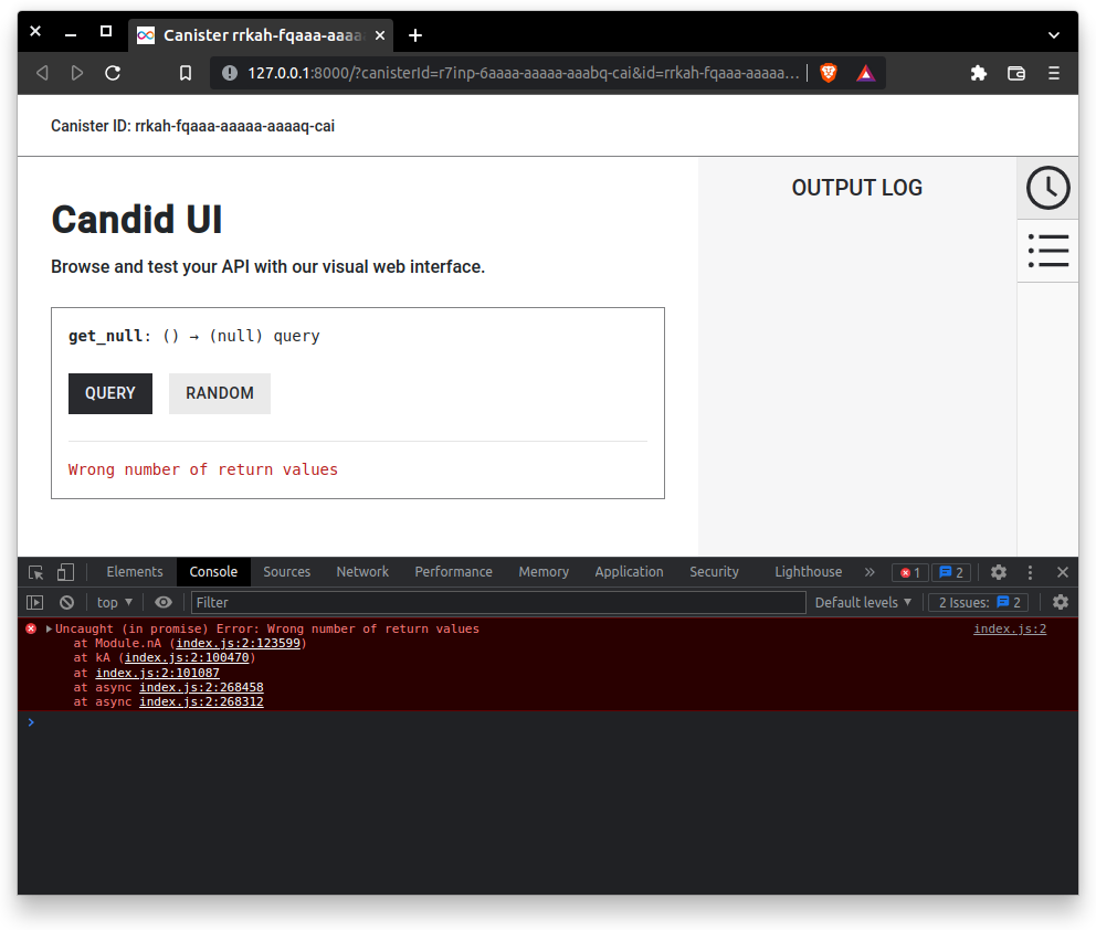 get_nullcanister method - Note that the error message "Wrong number of return values" is displayed in the UI and in the console.