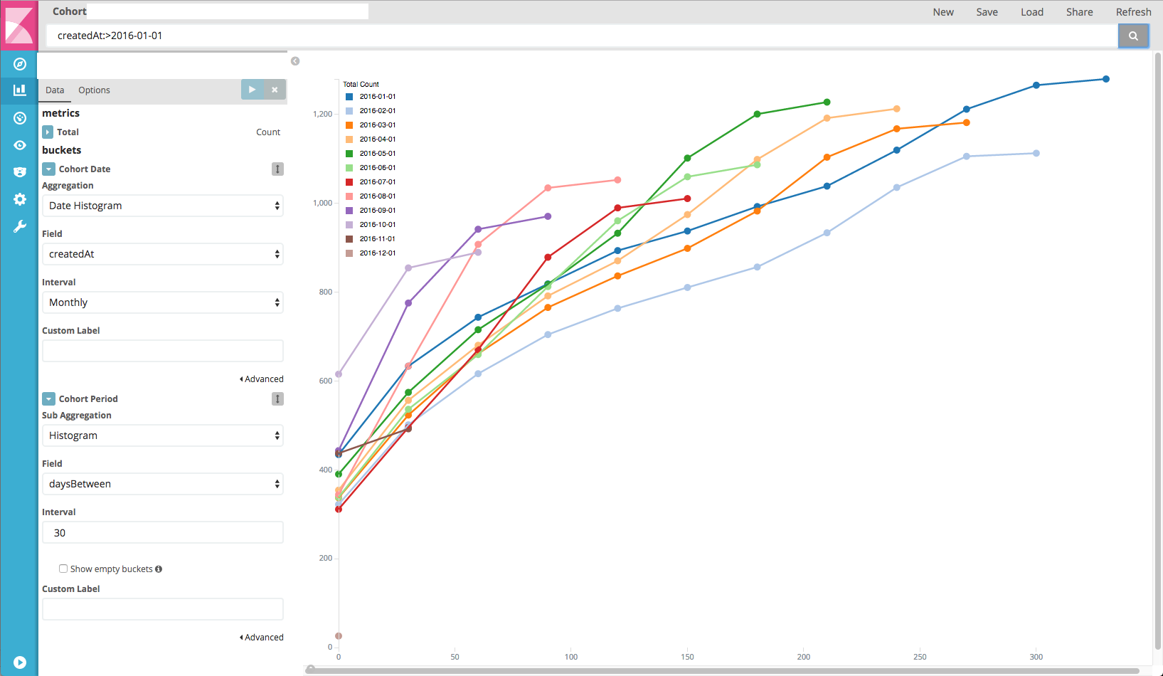 Show percetual values. - The cohort date bucket is the date used to draw the chart lines. Each bucket is a line in this chart. It should be a date histogram.