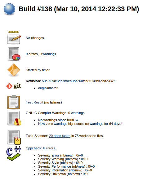 TODOorFIXMEand these are then summarized. - Cpp-check: A static analysis is run on the code to identify common problems. E.g. null-ptr dereferencing, undefined value usage etc.