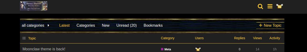 Moonclaw Theme A Moonclaw theme for Discourse, ported from PHPBB. Original theme credited to Moonclaw. Screenshot Header Footer Composer