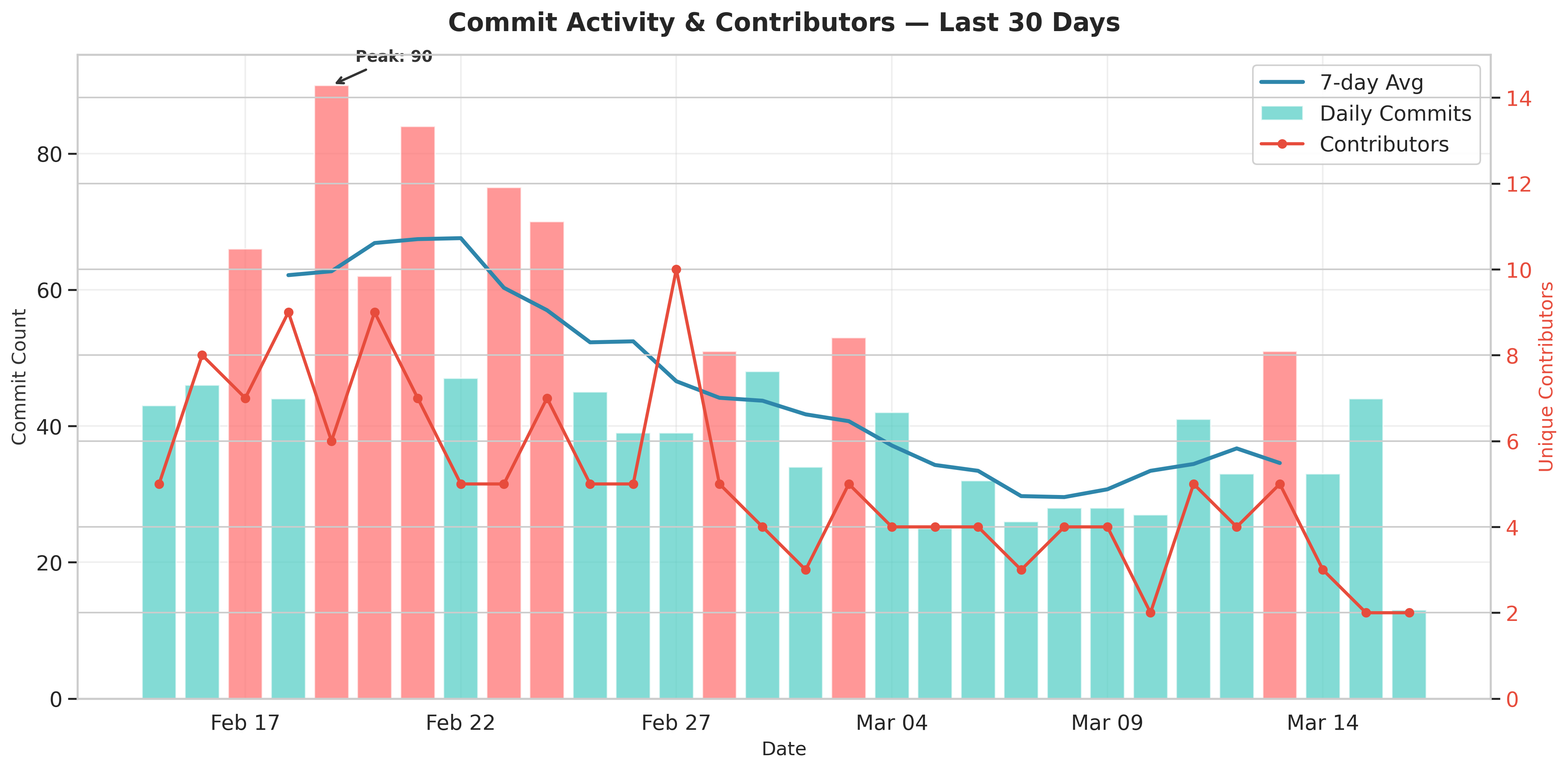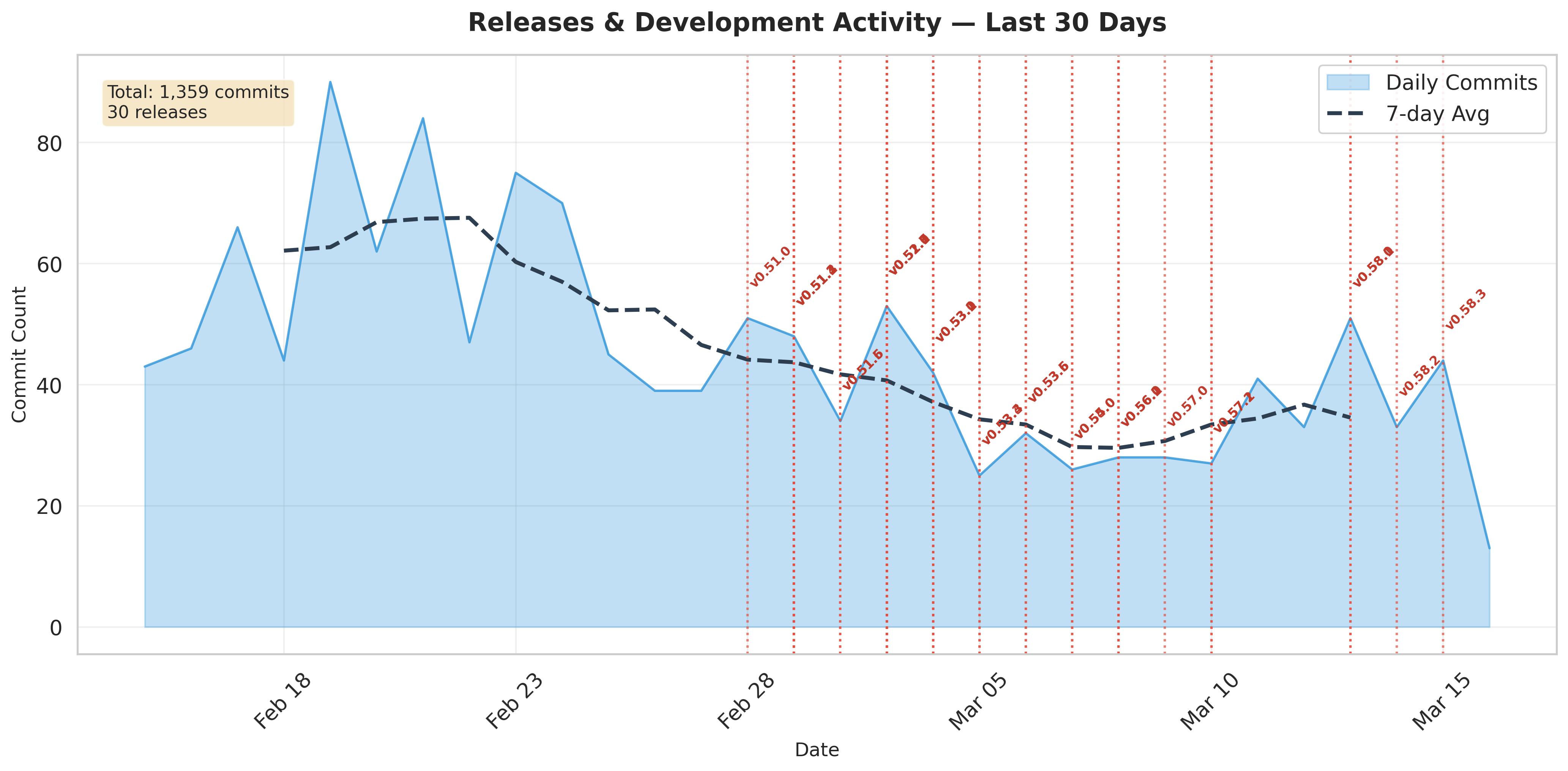 The team peaked at 90 commits on Feb 19 — a truly remarkable sprint. The vertical markers show release cadence: a steady rhythm of tagged releases keeps features flowing to users. The 7-day moving average (dashed line) shows healthy sustained activity in the 30–55 commits/day range throughout March.