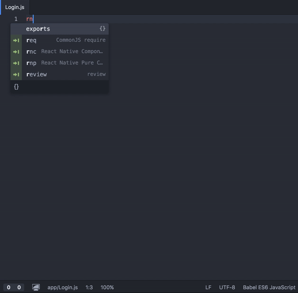 react-native-snippets React Native snippets for Atom and Nuclide. Installation Run the following terminal command: apm install react-native-snippets Usage The package provides two snippets rnc - React Native Class Component Boilerplate rnp - React Native Pure Component Boilerplate