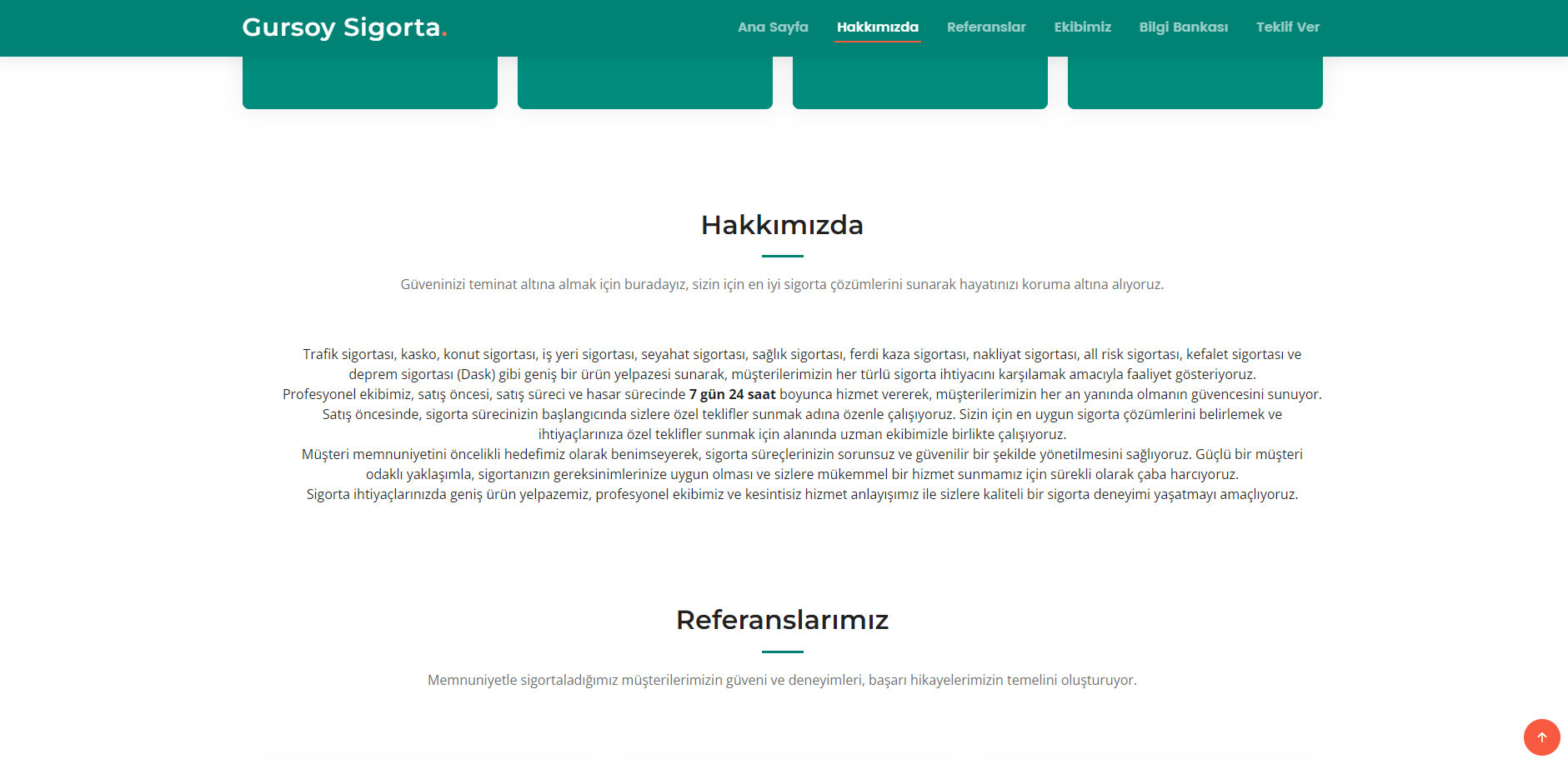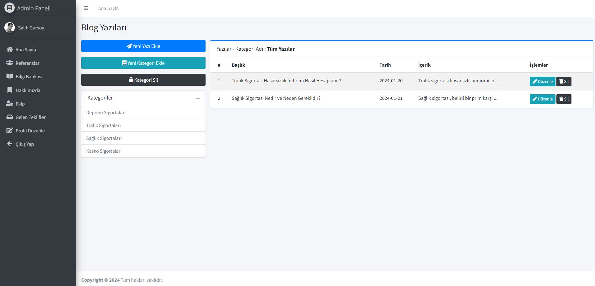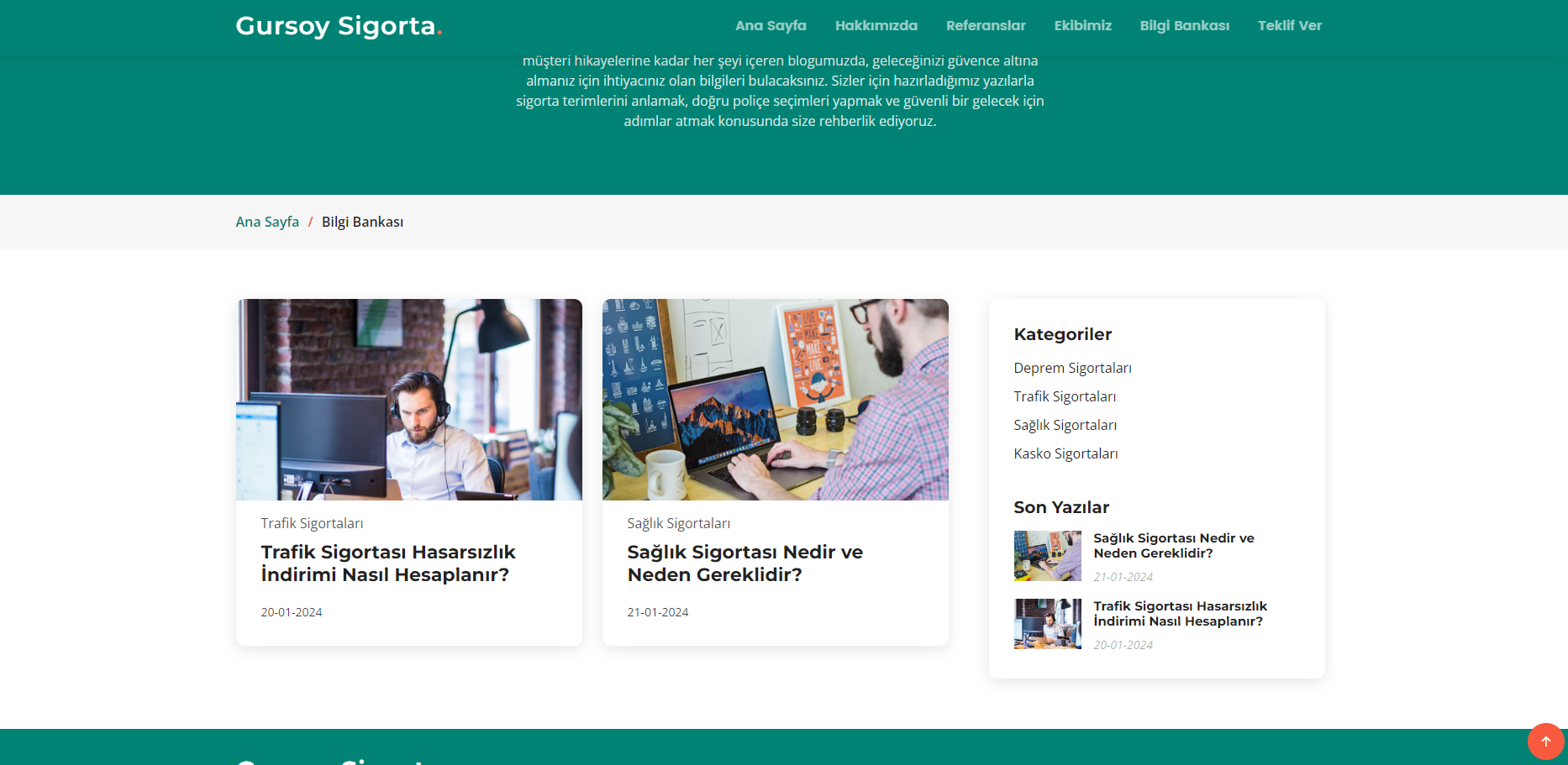 - Default panelinde hakkımızda, referanslarımız, ekibimiz ve blog yazıları gibi menüler bulunmaktadır. Ayrıca teklif verme formu ile birlikte trafik sigortası, deprem sigortası, kasko sigortası gibi formları doldurarak teklif gönderilebilmektedir. Blog yazılarında kategorilere göre filtreleme seçenekleri bulunmaktadır.