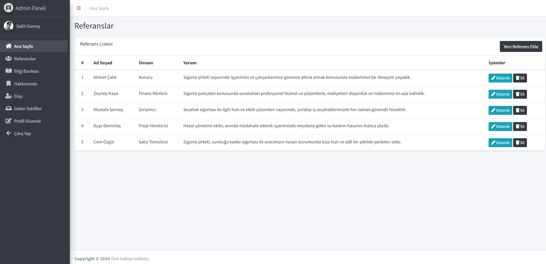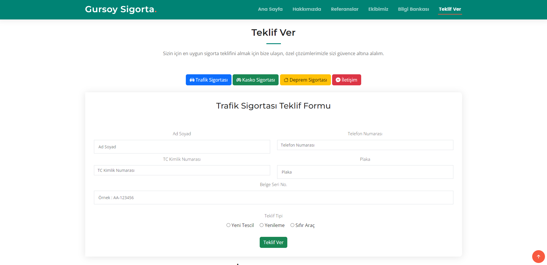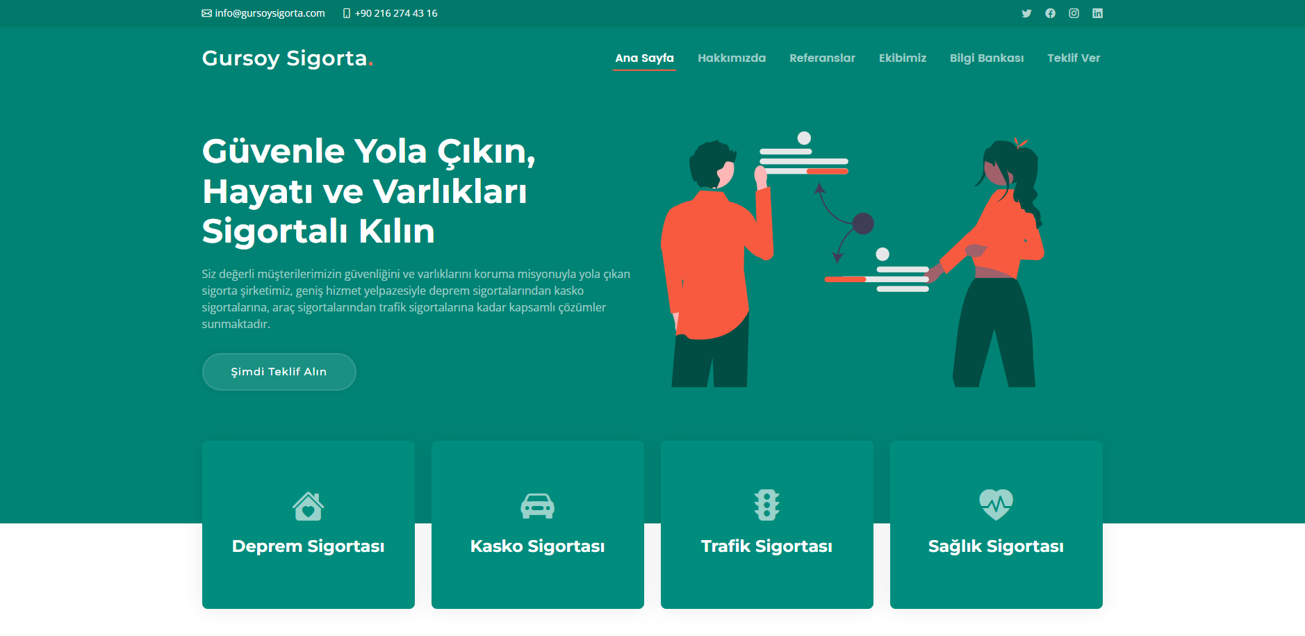 - Default panelinde hakkımızda, referanslarımız, ekibimiz ve blog yazıları gibi menüler bulunmaktadır. Ayrıca teklif verme formu ile birlikte trafik sigortası, deprem sigortası, kasko sigortası gibi formları doldurarak teklif gönderilebilmektedir. Blog yazılarında kategorilere göre filtreleme seçenekleri bulunmaktadır.