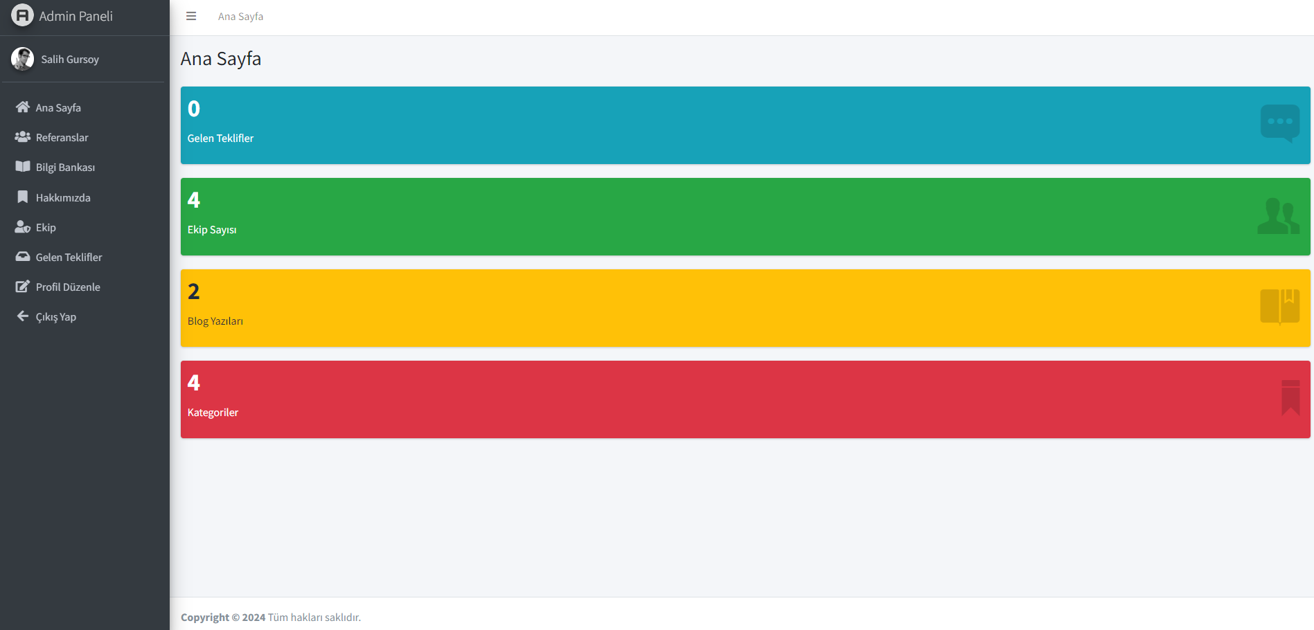 - Admin panelinde gelen teklifler görüntülenebilir. Kategorilere göre blog yazıları ekleme silme güncelleme işlemleri yapılabilir. Referanslar, hakkımızda gibi bilgiler düzenlenebilir. Tamamen dinamik bir projedir.