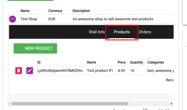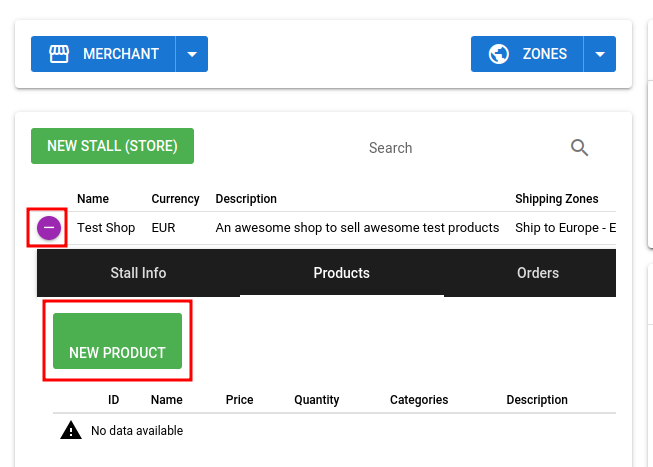 Click on the "Plus" button to open the stall details and click "New Product" to create a product