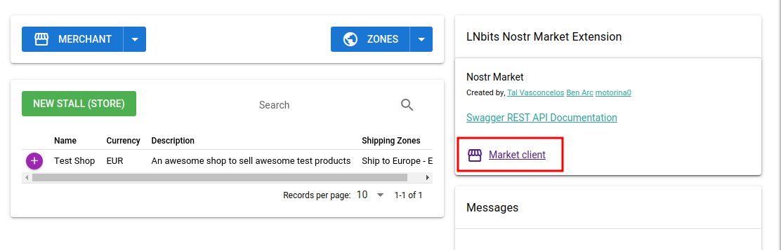 LNbits also provides a Nostr Market client app. You can visit the client from the merchant dashboard by clicking on the "Market client" link