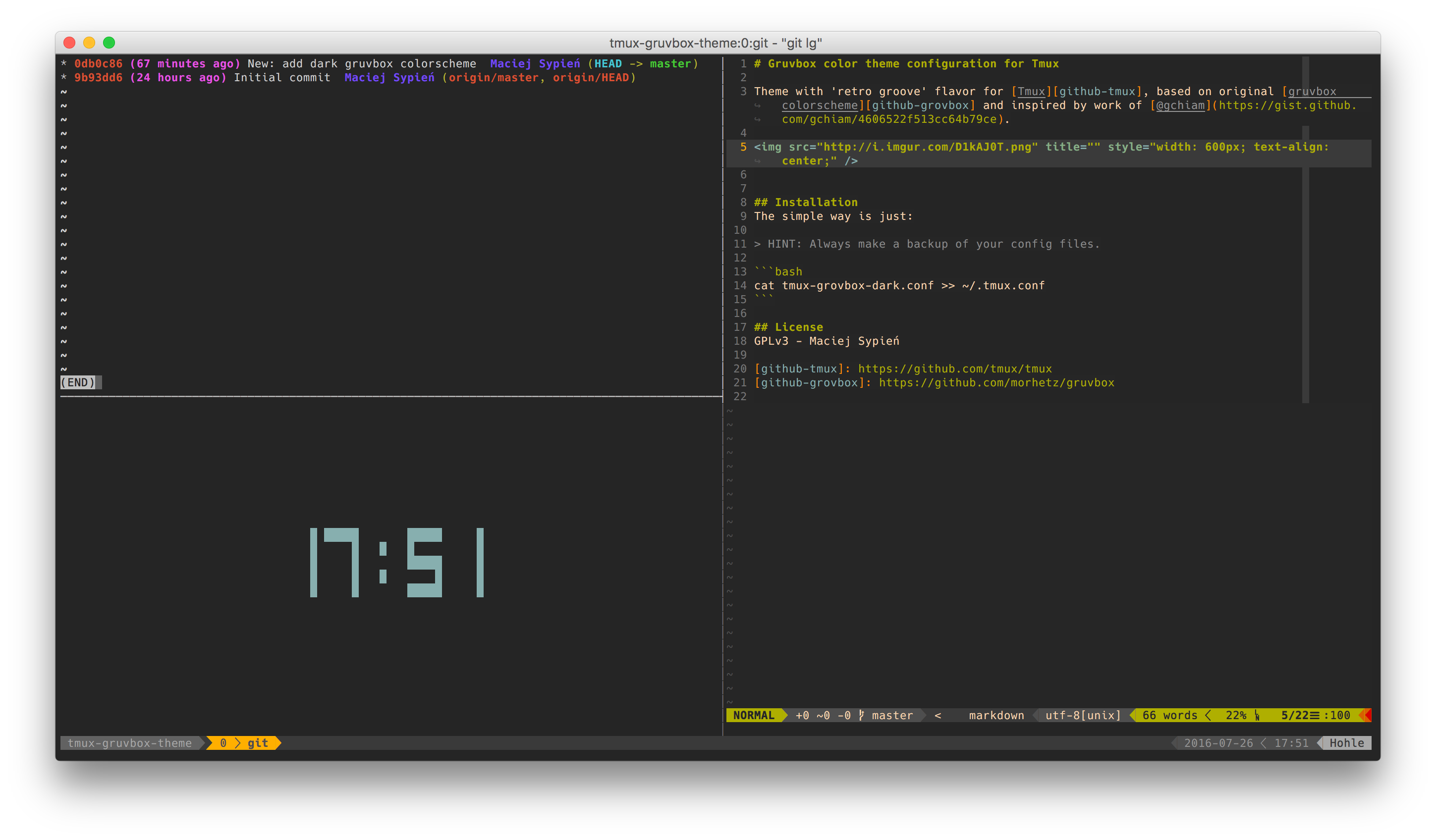 Theme with 'retro groove' flavor for Tmux, based on Pavel Pertsev's gruvbox colorscheme and inspired by work of Gordon Chiam.