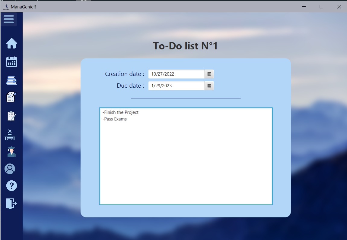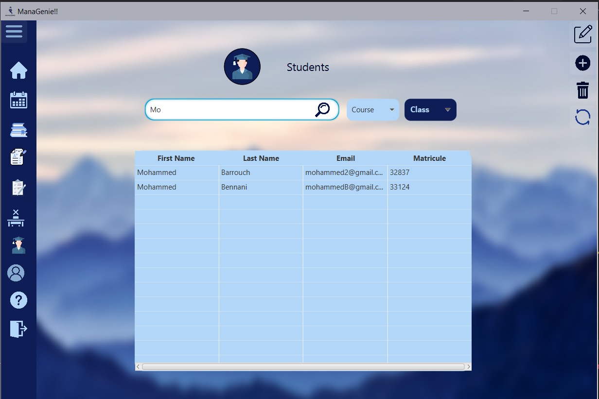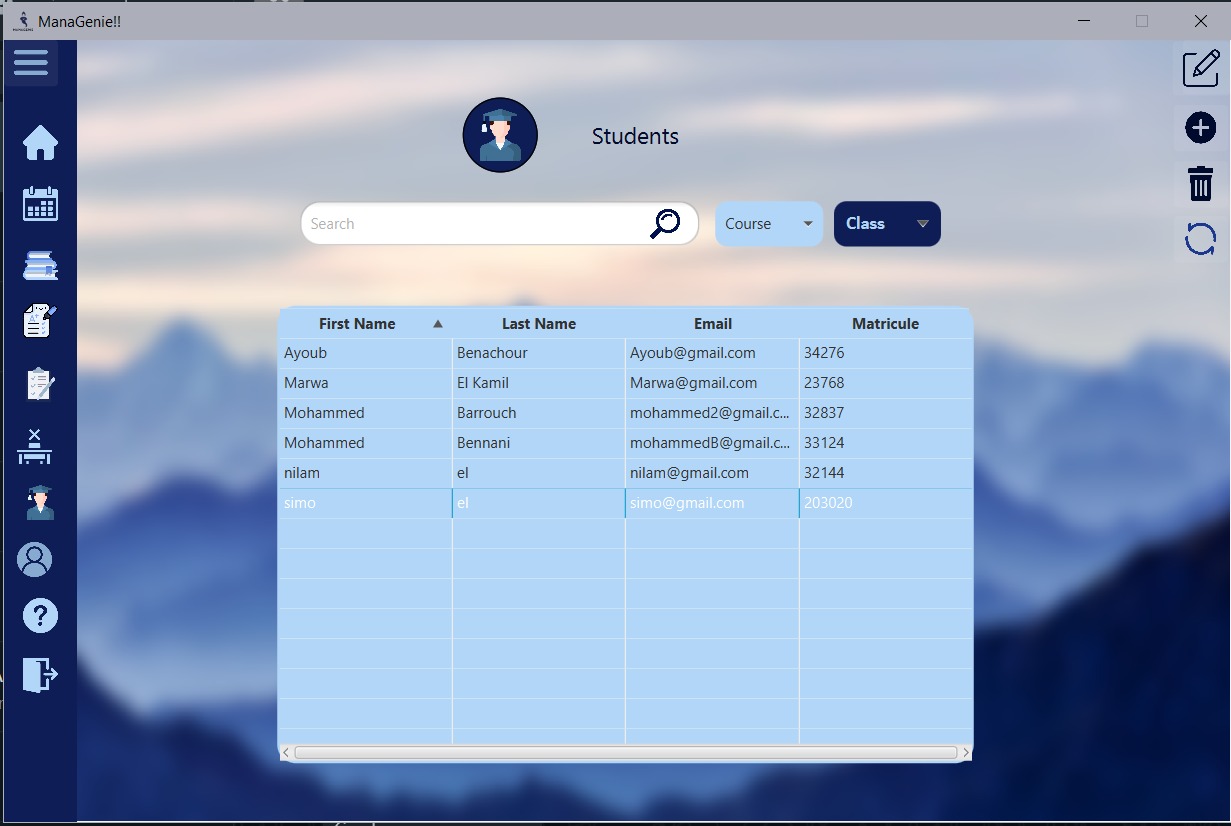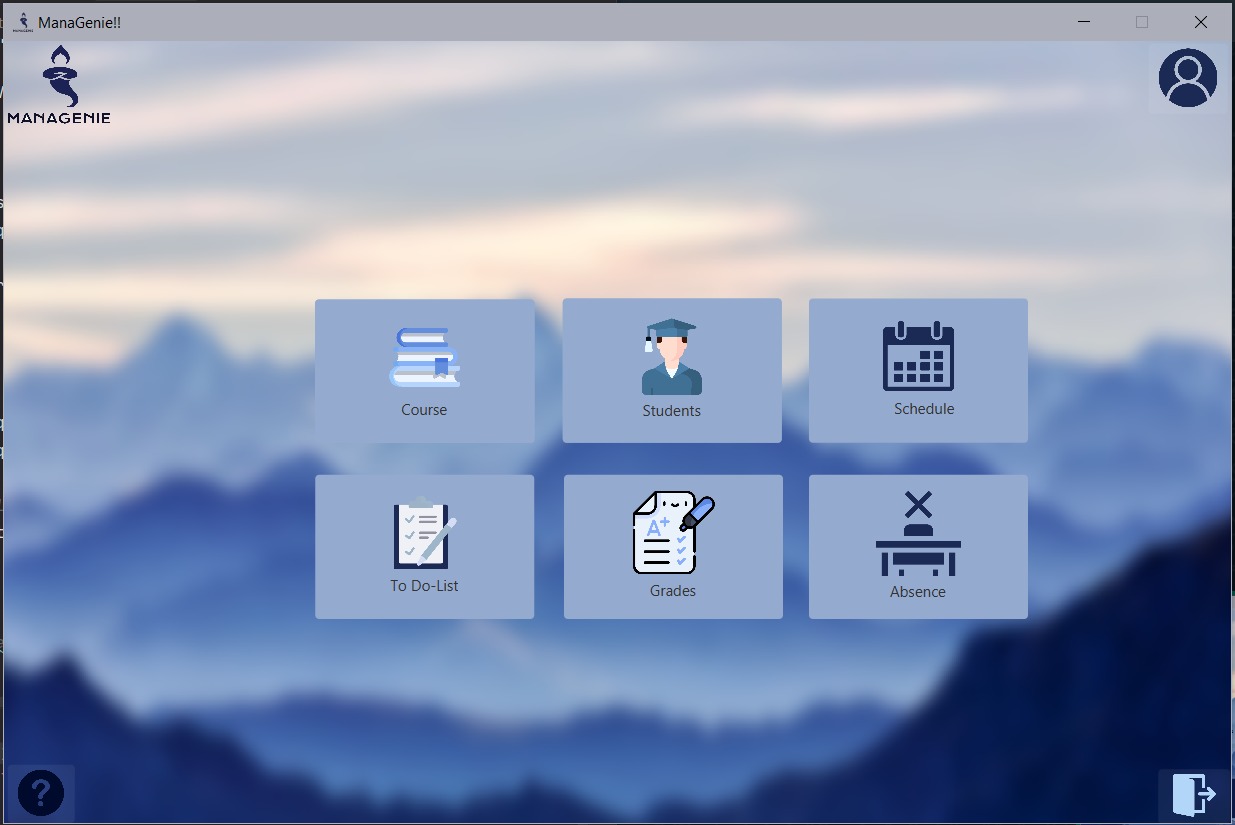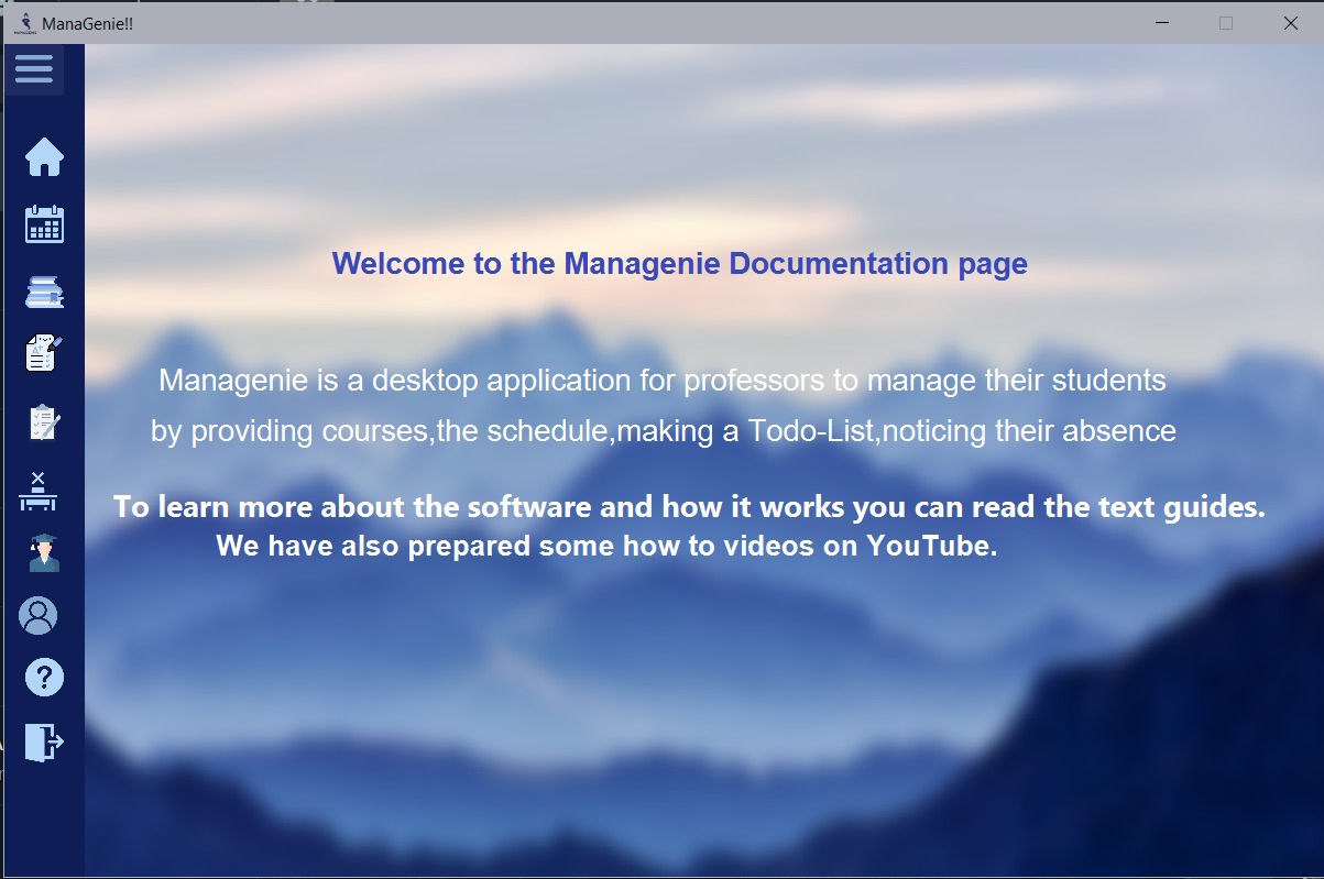 ManaGenie is a desktop management application for professors it helps them To add courses and grades , to add/modify, or delete students, ,to upload their plans, and also to make a to-do list, to notice the absence of students.
