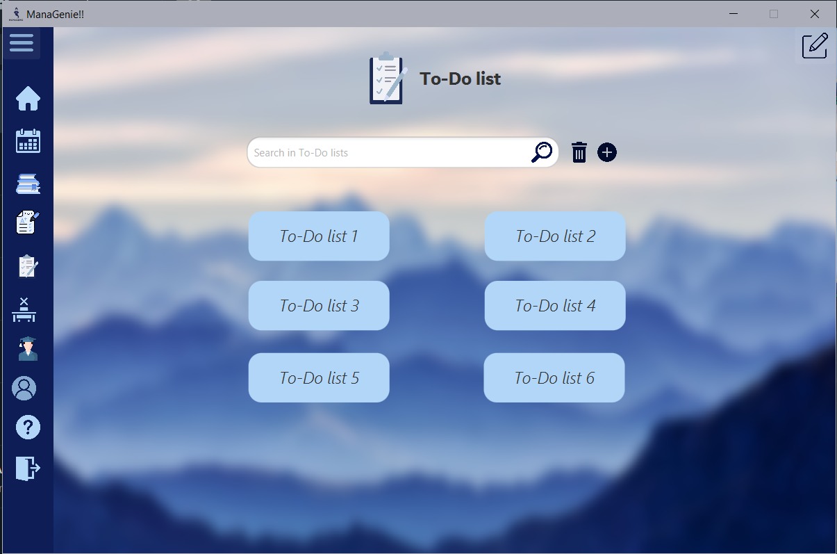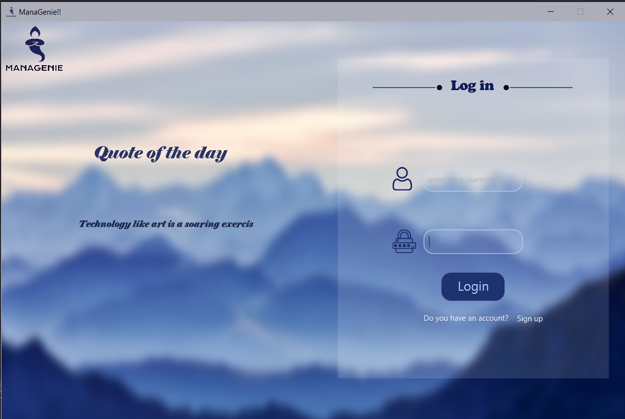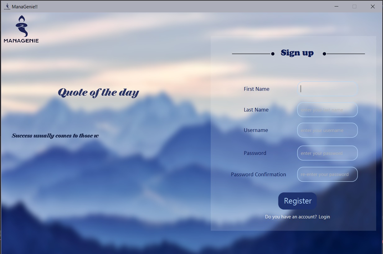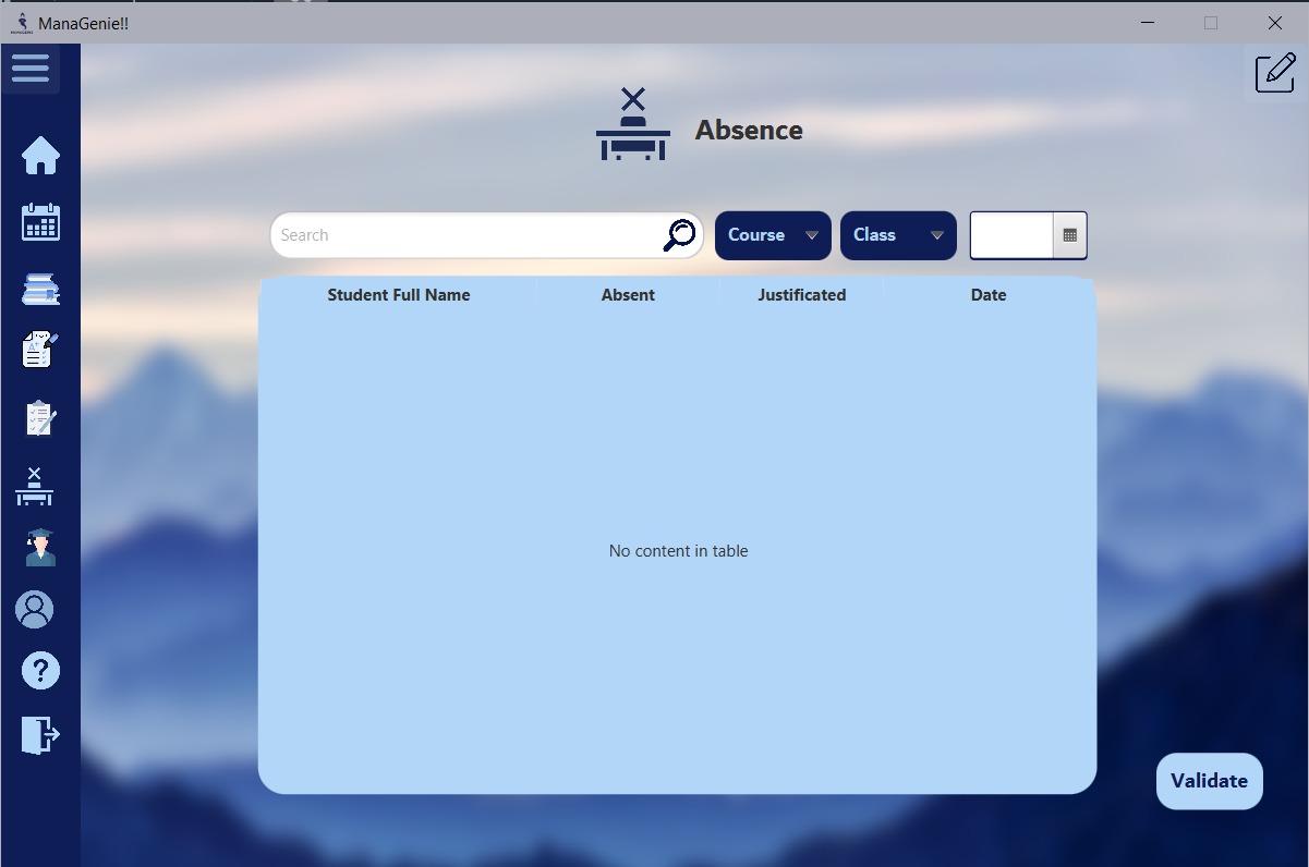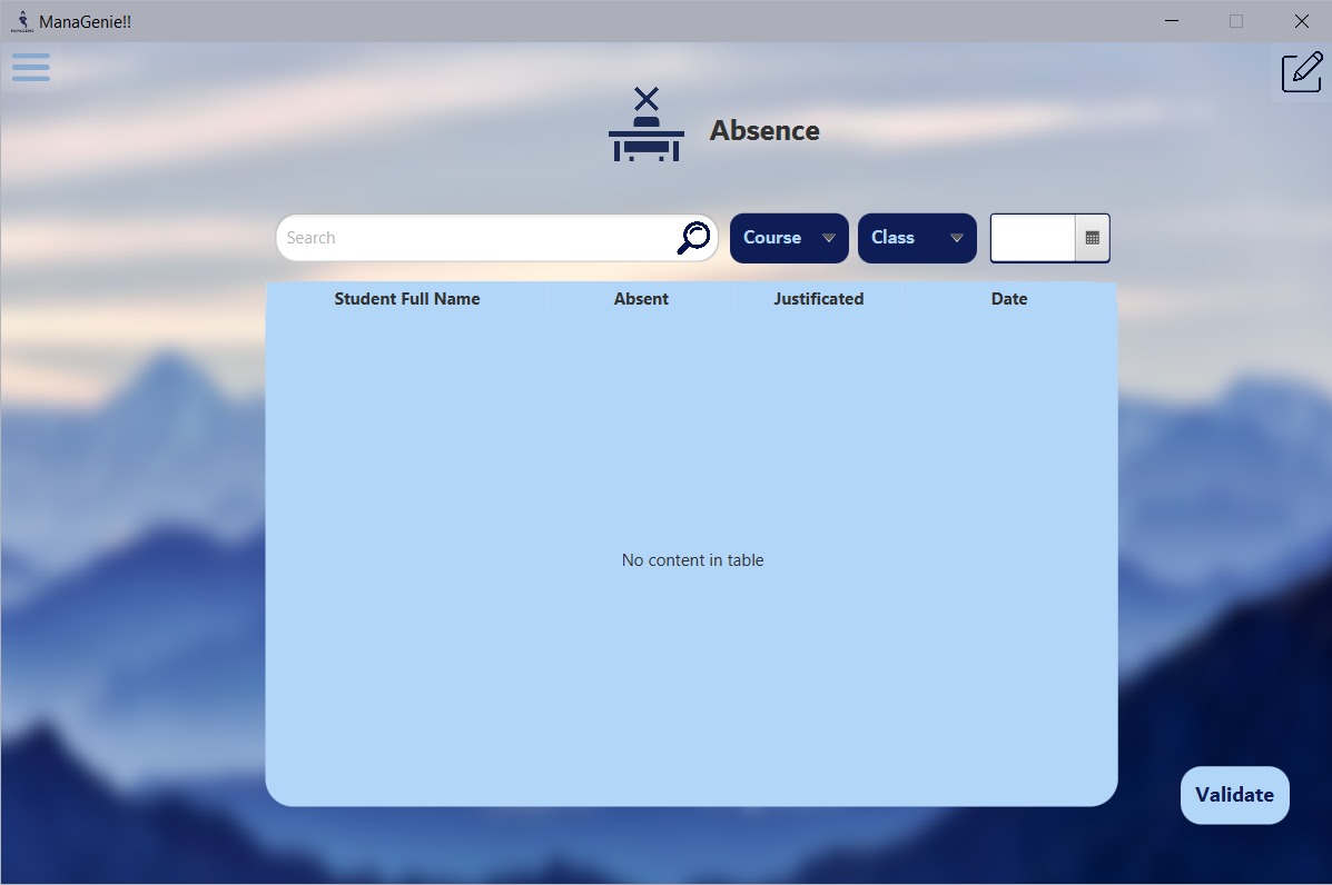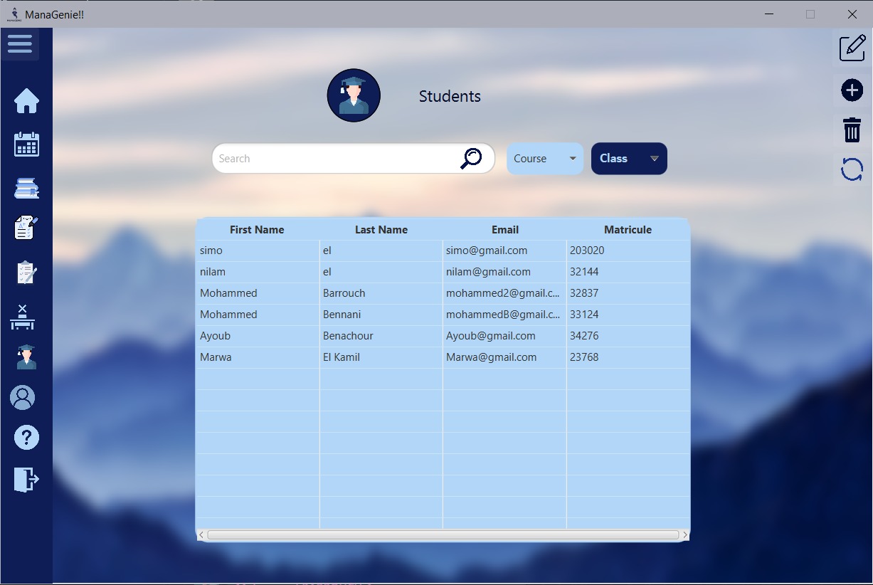 ManaGenie is a desktop management application for professors it helps them To add courses and grades , to add/modify, or delete students, ,to upload their plans, and also to make a to-do list, to notice the absence of students.