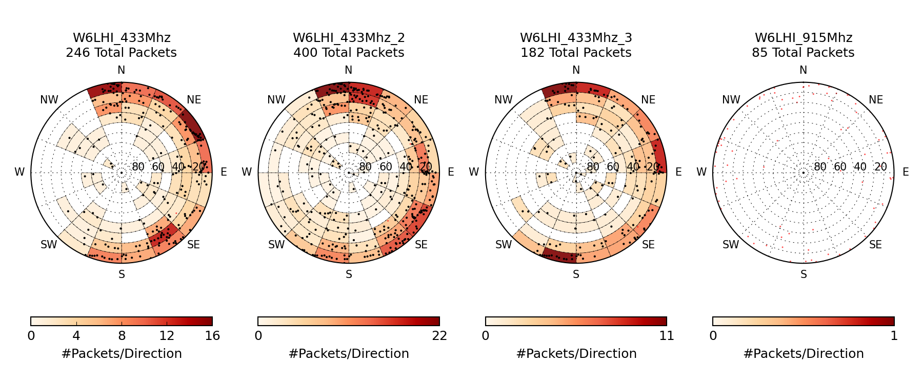 My four active stations show very different reception patterns. These are a 433Mhz vertical 1/4 wave antenna, a 433Mhz vertical dipole, a 433Mhz horizontal dipole, and a 1/4 wave 915 Mhz antenna (that has received nothing useful as there aren't any satellites presently transmitting). All are on the East side of the house and somewhat blocked towards the West.