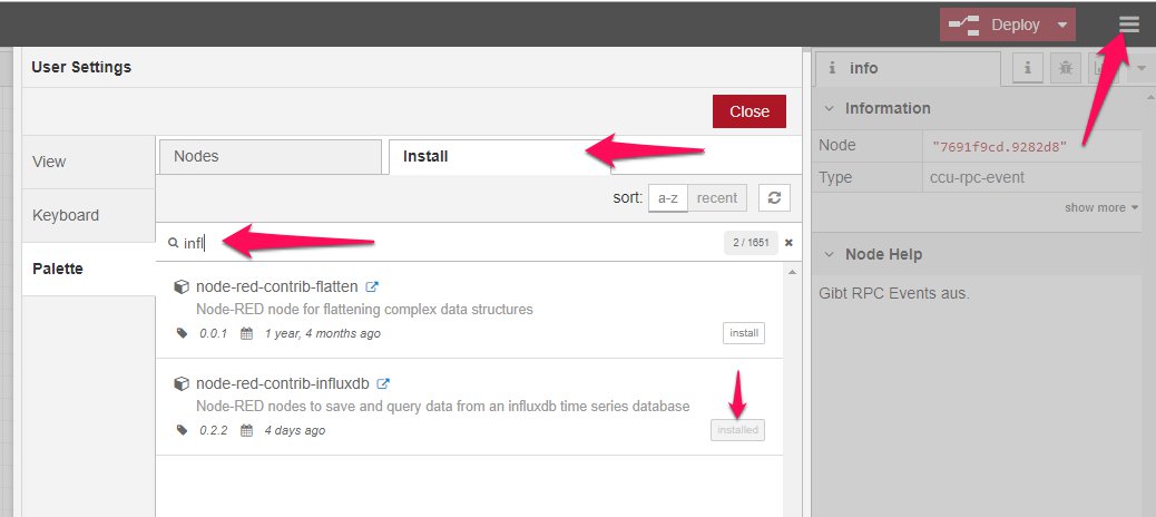 Dann in redmatic influxdb adapter installieren: Burger-Menu, manage palette, dann