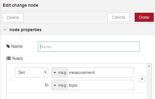Mit change node die in msg.topic enthaltenen Daten in msg.measurement umspeichern, da influxdb die Daten dort erwartet