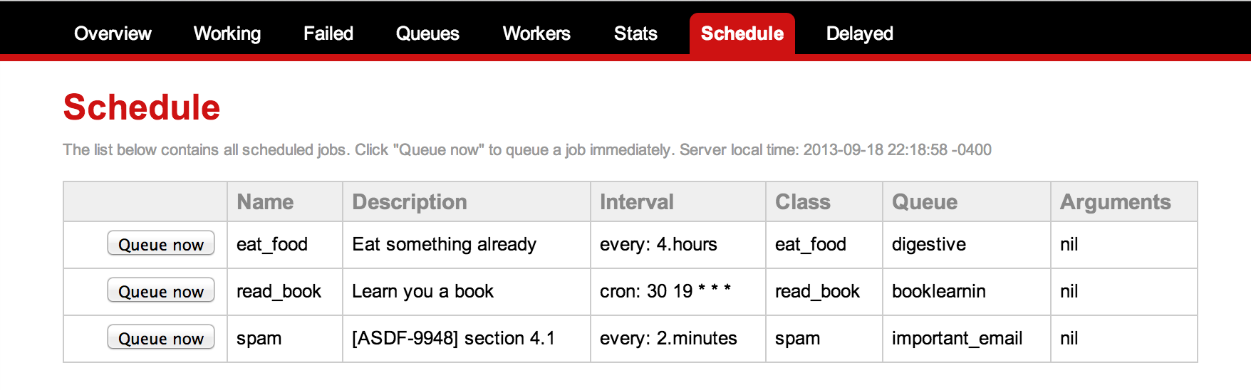 Resque-scheduler also adds two tabs to the resque-web UI. One is for viewing (and manually queueing) the schedule and one is for viewing pending jobs in the delayed queue.
