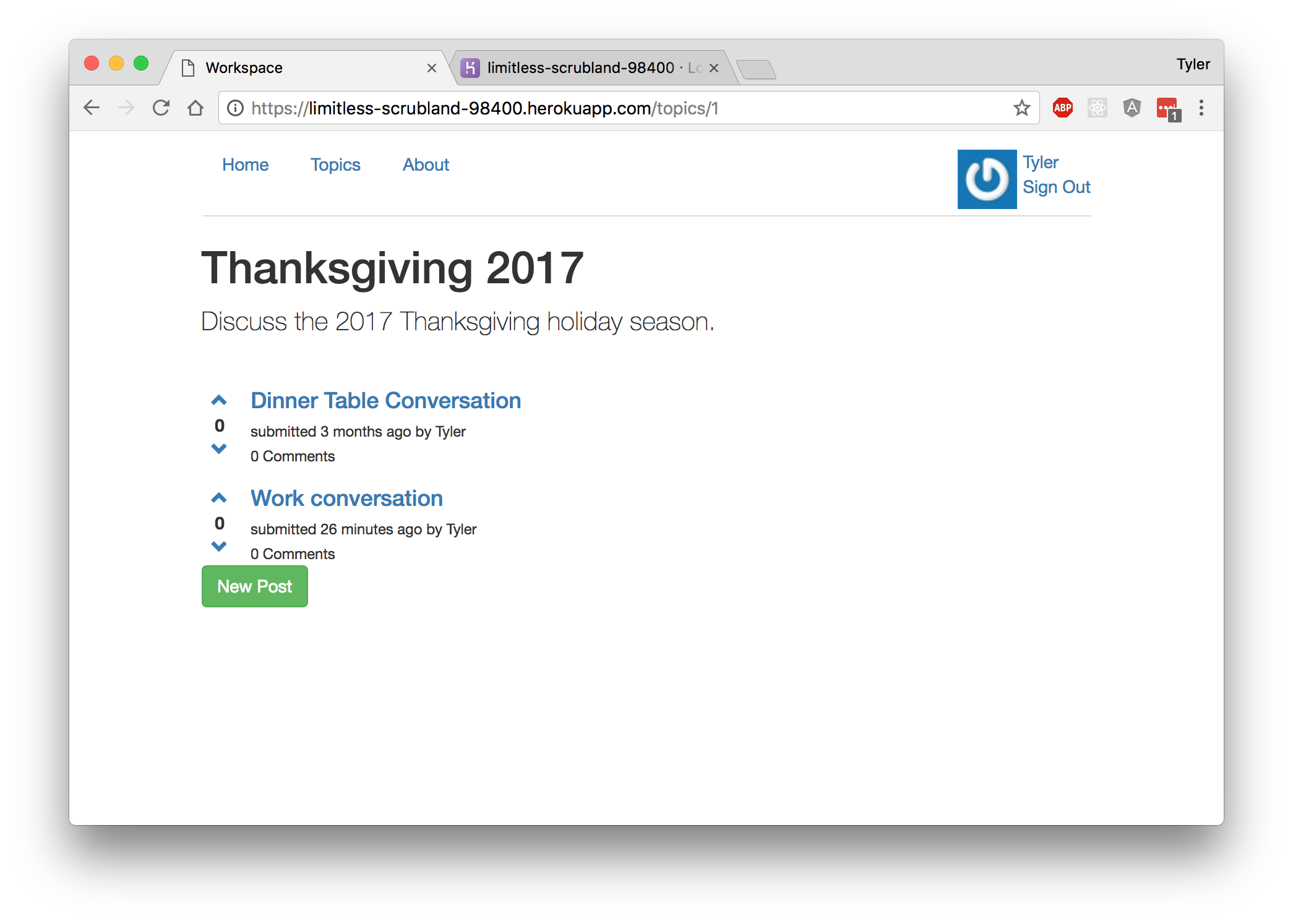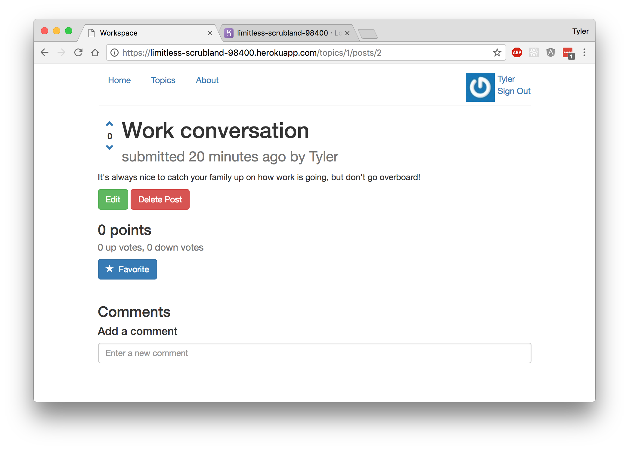 This web application is a reddit-styled forum site written in Ruby on Rails. Bloccit users can contribute to a variety of conversation topics. Members vote on the relevance of each post so that current trends are apparent to all users.