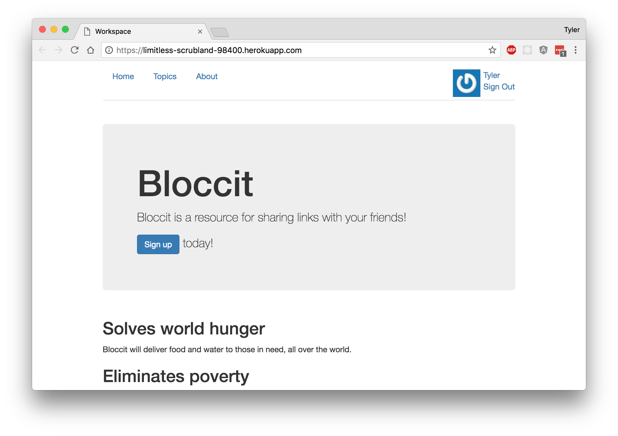 The production Bloccit environment is hosted by a free version of Heroku's dynamos. When not in use these computational units, perhaps best compared with 'containers', power down so the first user after a period of inactivity may experience a short delay before Bloccit responds.