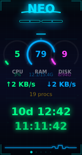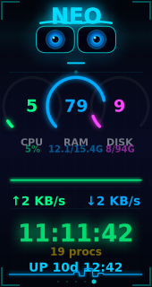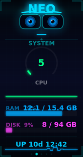 sensors/neo_status.js— 560 lines, system metrics sensor + REST API + Proxmox integrationwidgets/neo_eyes.js— 844 lines, animated face + 5-skin dashboard enginethemes/neo_avatar/— theme config + 7 face expression PNG assets