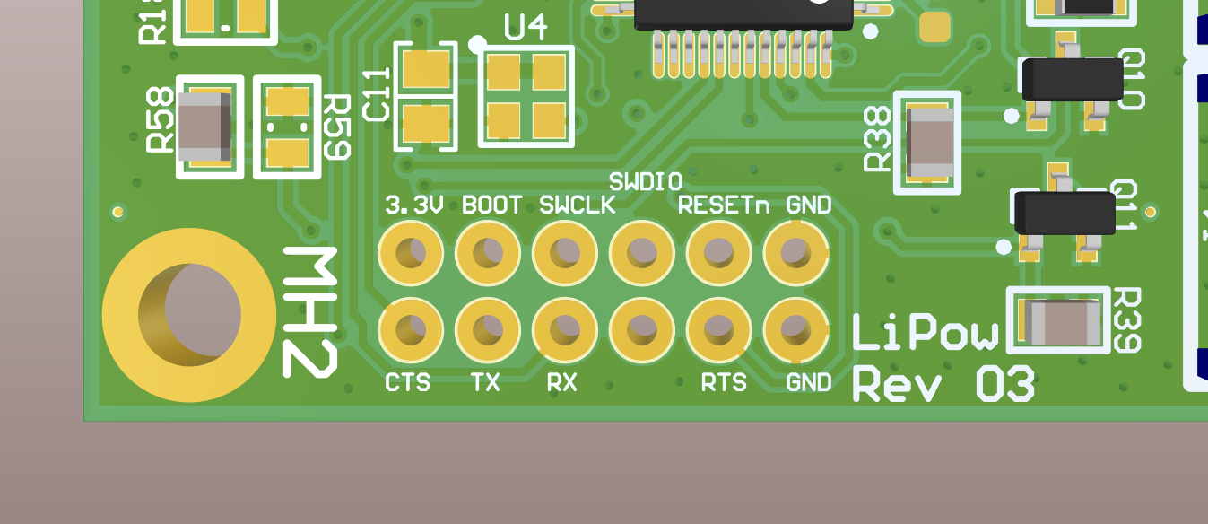 To place the STM32G0 into bootloader mode and enable UART firmware loading, jumper BOOT0 to 3.3V before powering on. Use one of the above programs with UART to load the firmware. All necessary pins are located on the debug header shown below.